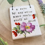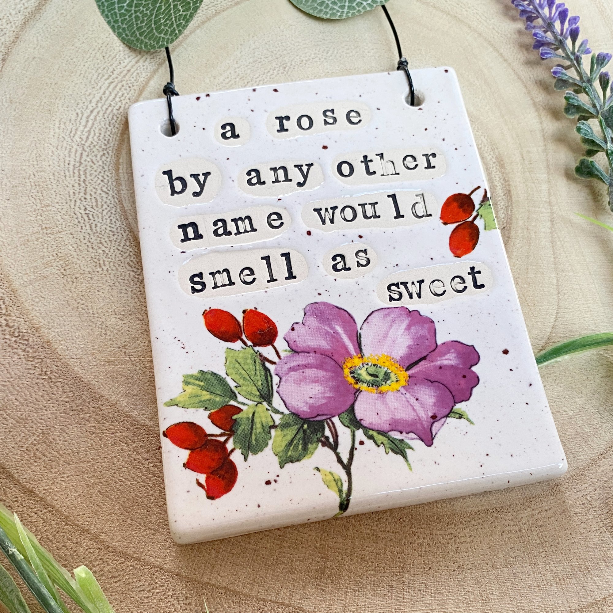 This ceramic sign has been made using white earthenware clay. I cut the shape by hand and added two holes for wire. The letters were individually stamped to read the quote "A rose by any other name would smell as sweet" by Shakespeare and then left to dry between two boards for over a week to help it stay flat. Once dry it was bisque fired, the black was then added to the lettering and a wax resist was applied over the letters (you may have seen this on instagram) I then glazed in a gorgeous speckled white and fired again to over 1000 degrees celsius. Once out of the glaze firing the decals were cut by hand and applied before the sign was put back in the kiln for a third firing. Wire was added so it can be hung on the wall.