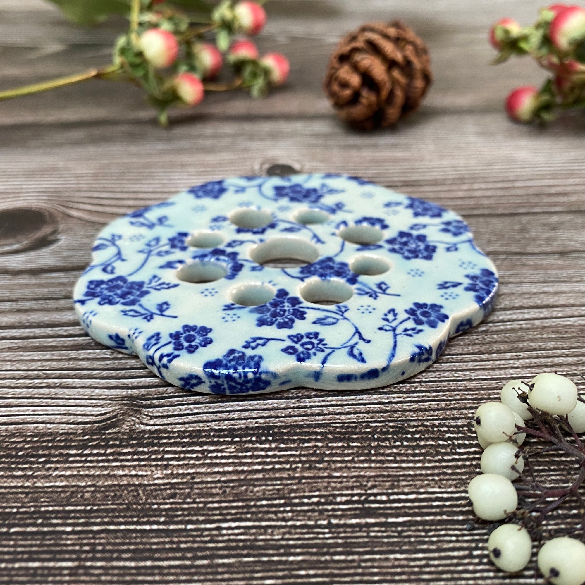 This handmade ceramic flower frog is made using creamy stoneware clay which has a blue floral transfer applied and then glazed in a pale blue glaze. Fired up to 1200 degrees making this strong and durable. The back is left unglazed.