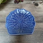 This pretty dish is made from creamy stoneware clay and finished with a rich blue glaze. I used a wooden block stamp to press the design before cutting and shaping it, gently raising the edges to form a curved dish.