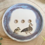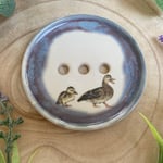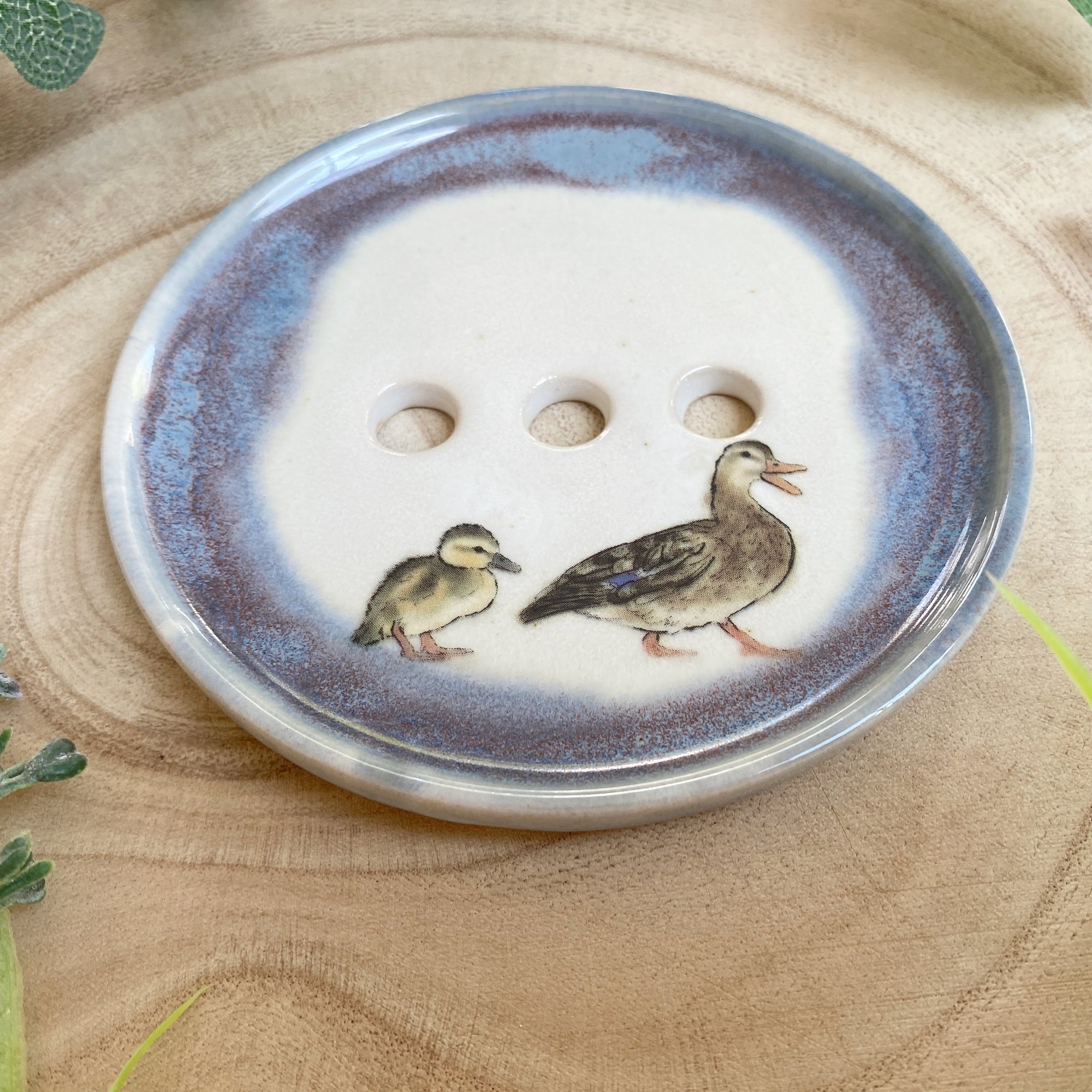 This handmade ceramic dish has been thrown on the pottery wheel using creamy smooth stoneware clay. I have used two glazes on this piece, a speckled cream and a reactive blue around the edge. The cream is the perfect background for these cute duck decals which was then fired for a third time.