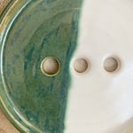 This handmade ceramic dish has been thrown on the pottery wheel using creamy smooth stoneware clay. This piece has been dipped in white glaze on one side and then a green on the other.