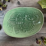 This pretty dish is made from creamy stoneware clay and finished with a very pretty green glaze. I used a wooden block stamp to press the design before cutting and shaping it, gently raising the edges to form a curved dish.
