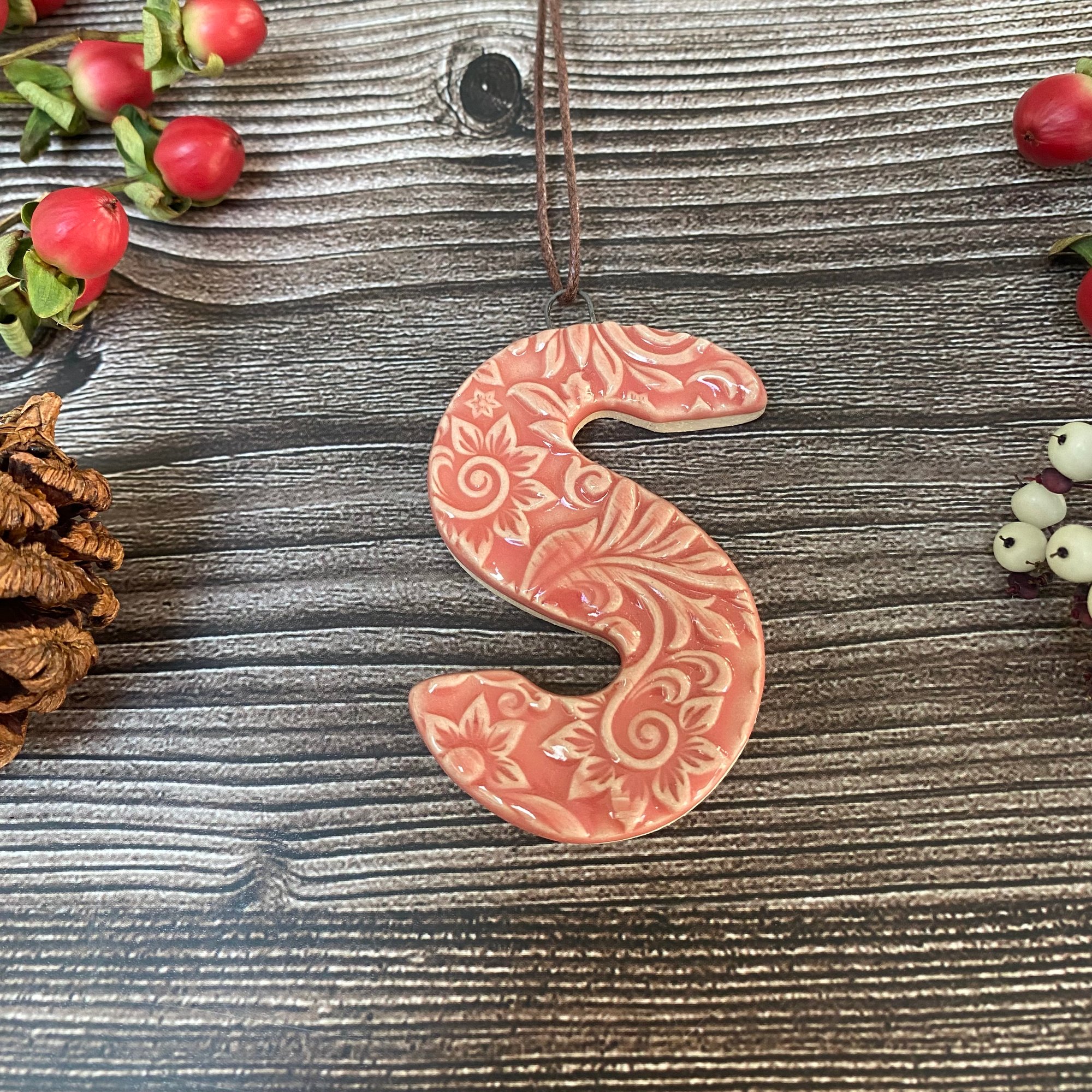 Hanging letter "S" made using strong creamy stoneware clay which has a textured pattern. Glazed in a pretty pink and brown cord attached for hanging.