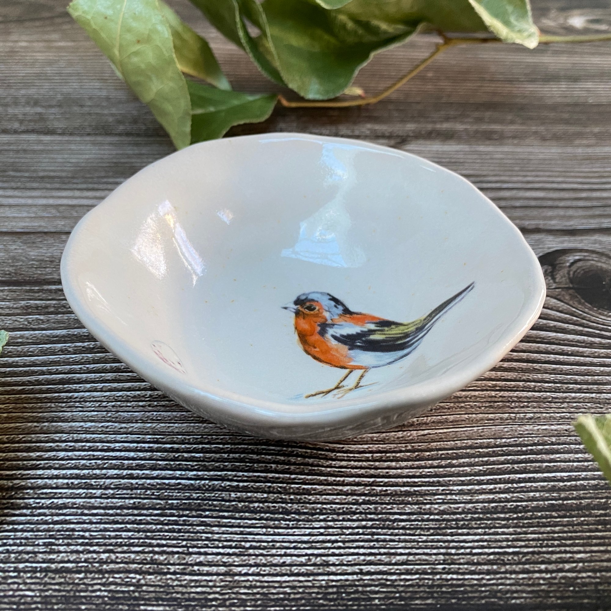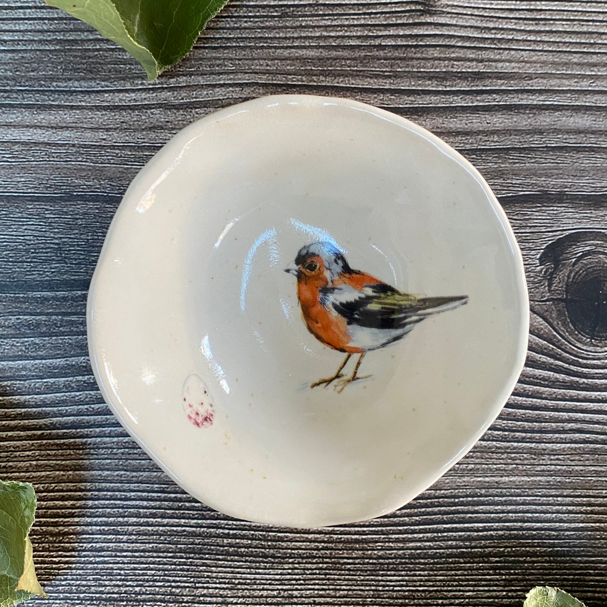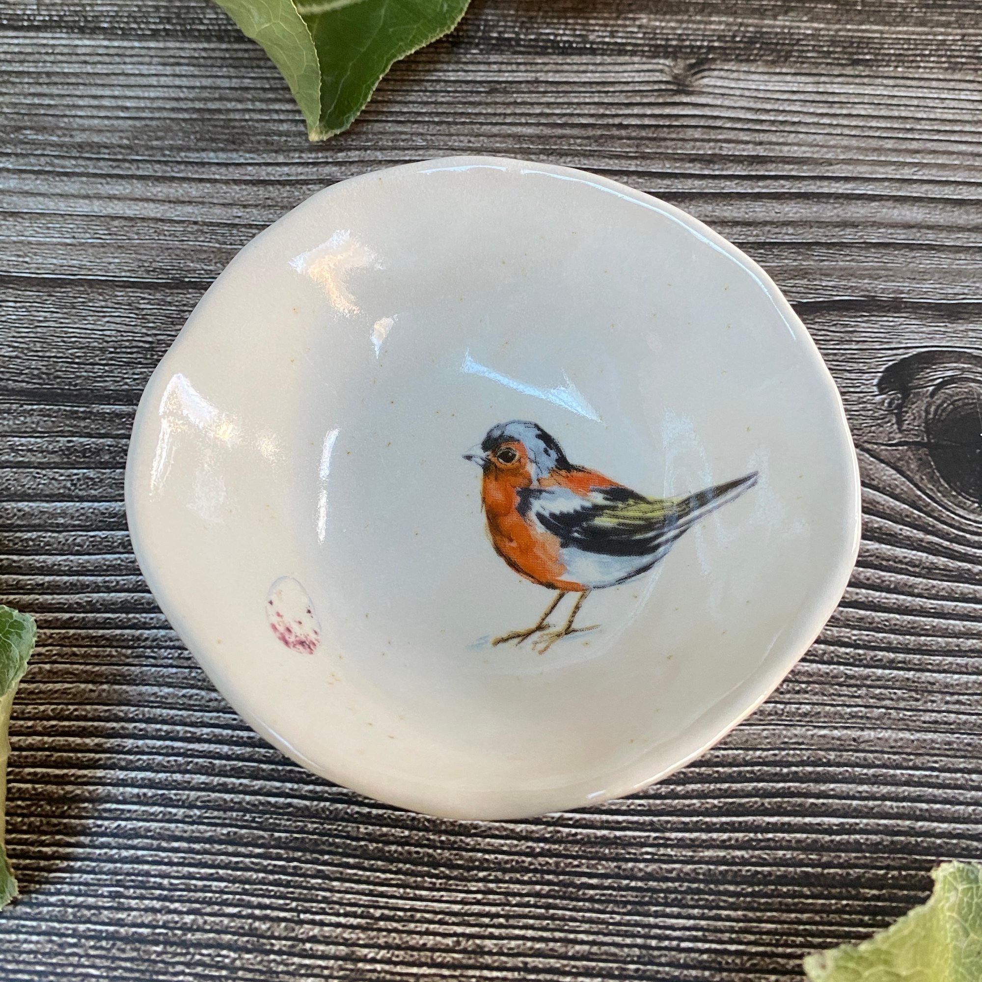 This pretty dish has been made using the pinch method in creamy stoneware clay and a beautiful cream lightly speckled glaze. This glaze is the perfect background for this gorgeous Chaffinch and egg decal.