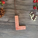 Hanging letter "L" made using strong creamy stoneware clay which has a textured pattern. Glazed in a pretty pink and brown cord attached for hanging.