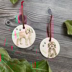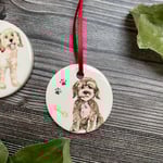 Lovingly made from earthenware clay, each hanging decoration is finished with a transparent glaze before little dogs decals are applied and they are fired for a THIRD time in the ceramic kiln. (I am not 100% sure of breed so going with Doodle and Poo).