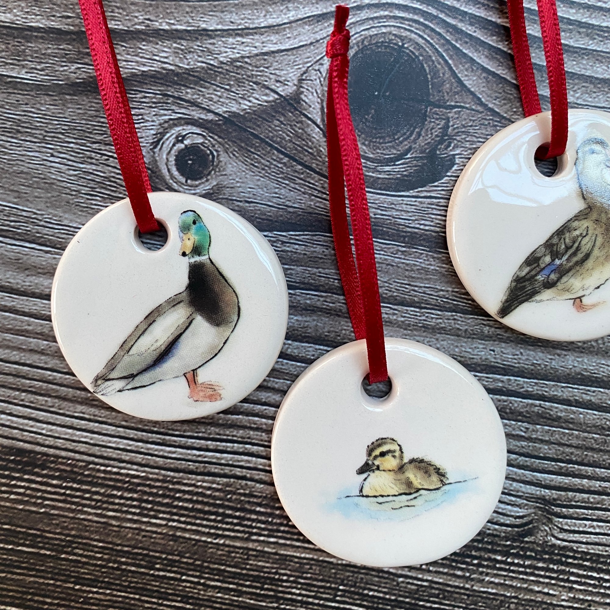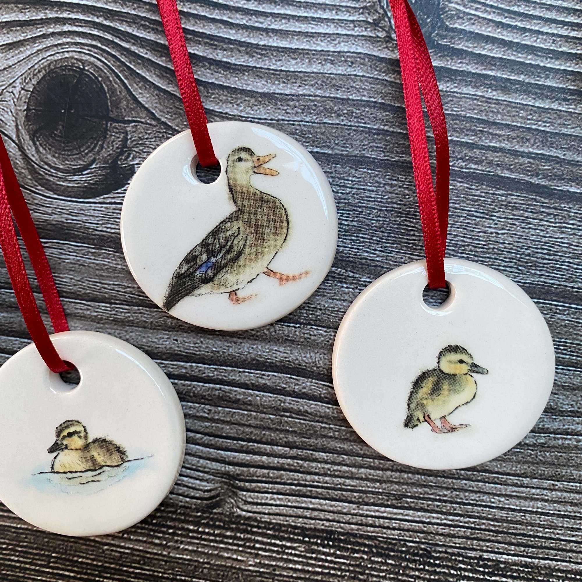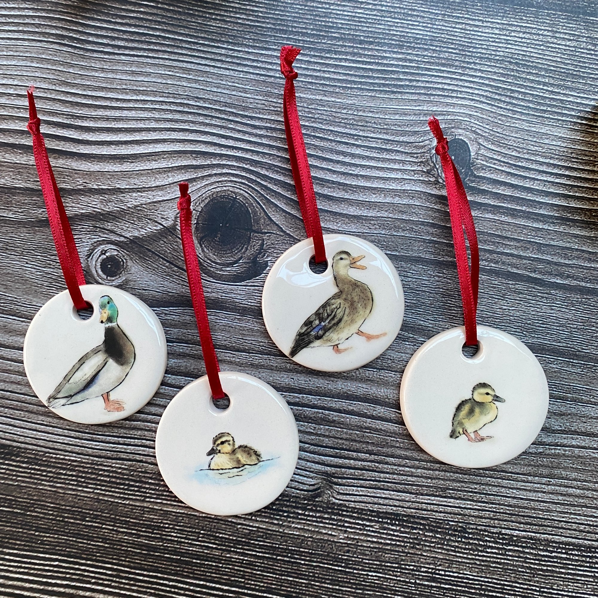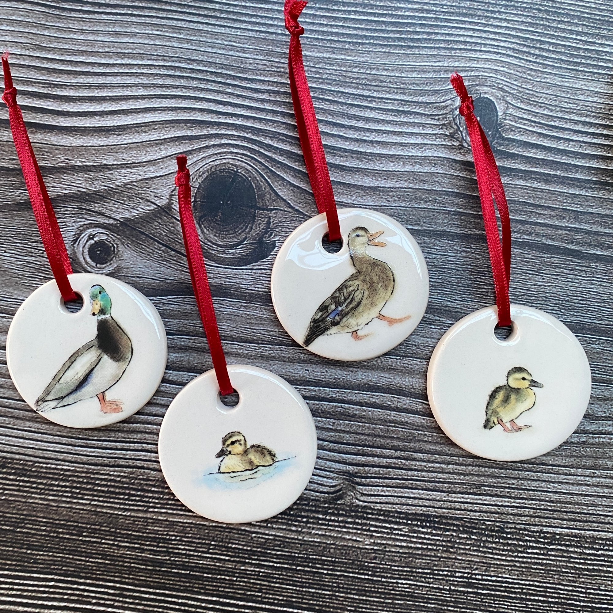 Add a touch of handcrafted charm to your festive décor with these ceramic Christmas tree ornaments. Lovingly made from earthenware clay, each decoration is finished with a transparent glaze before a family of ducks decals are applied and they are fired for a THIRD time in the ceramic kiln.