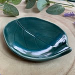 This green leaf dish has been made using creamy stoneware clay. A real leaf was impressed into the clay to form the texture. It has been glazed in a rainforest green glaze.