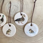 I have made this lovely set of duck family hanging decorations from white earthenware clay, clear glaze and decals.