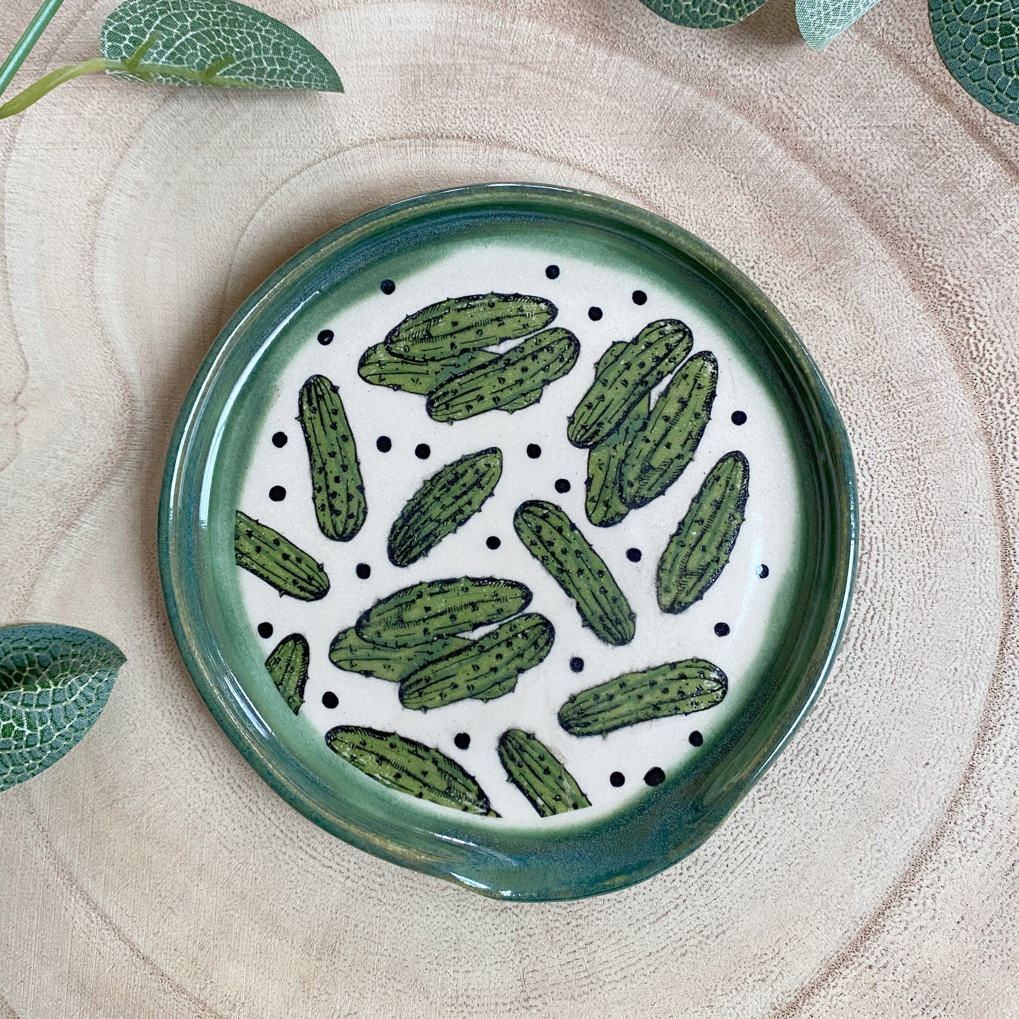 Ceramic spoon rest made using creamy stoneware clay, a pickles/gherkin transfer and a green glaze around the edge with transparent glaze over the pickles design.