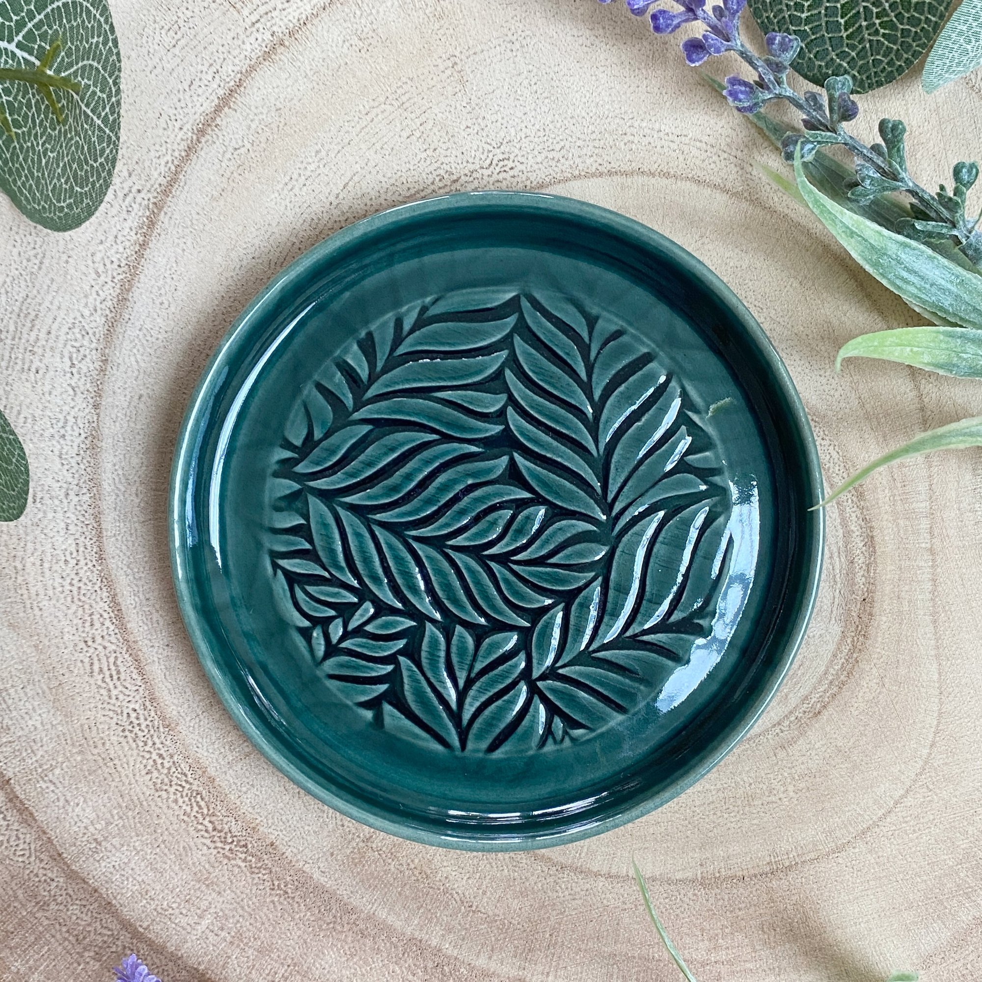 This handmade ceramic dish has been thrown on the pottery wheel using creamy smooth stoneware clay and features a beautiful leafy texture rolled into the surface. Glazed in a rich, glossy green.