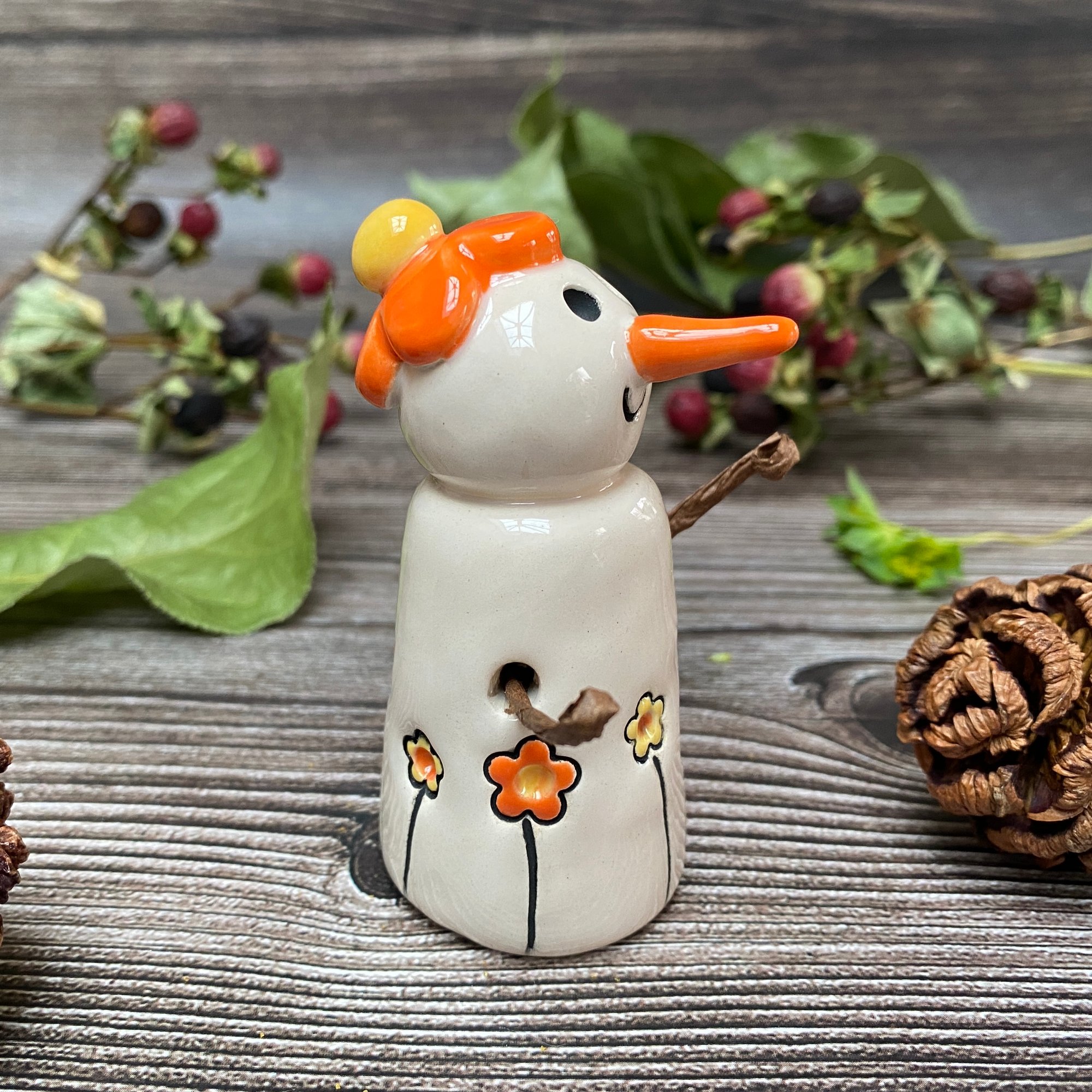 This adorable handmade snowpeep is crafted from white clay and features a shiny orange and yellow hat. All around the body this snowpeep has a yellow and orange flower design. Each piece is glazed with a variety of shiny finishes and fired twice in my ceramic kiln for durability and shine. The snowpeep’s arms are made from brown paper-covered wire, carefully glued in place. For safe packaging, the arms will arrive flat against the body and can easily be adjusted upon arrival.