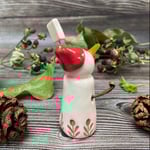 This adorable handmade snowpeep is crafted from white clay and features a shiny red hat with a Ho Ho Ho topper. All around the body this snowpeep has a red sprig skirt. Each piece is glazed with a variety of shiny finishes and fired twice in my ceramic kiln for durability and shine. The snowpeep’s arms are made from brown paper-covered wire, carefully glued in place. For safe packaging, the arms will arrive flat against the body and can easily be adjusted upon arrival.