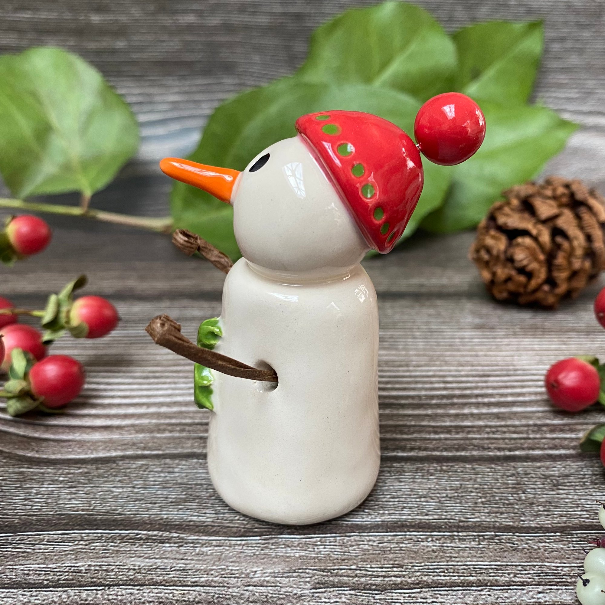 This adorable handmade snowpeep is crafted from white clay and features a shiny red bobble hat and a holly sprig on the belly. Each piece is glazed with a variety of shiny finishes and fired twice in my ceramic kiln for durability and shine. The snowpeep’s arms are made from brown paper-covered wire, carefully glued in place. For safe packaging, the arms will arrive flat against the body and can easily be adjusted upon arrival.