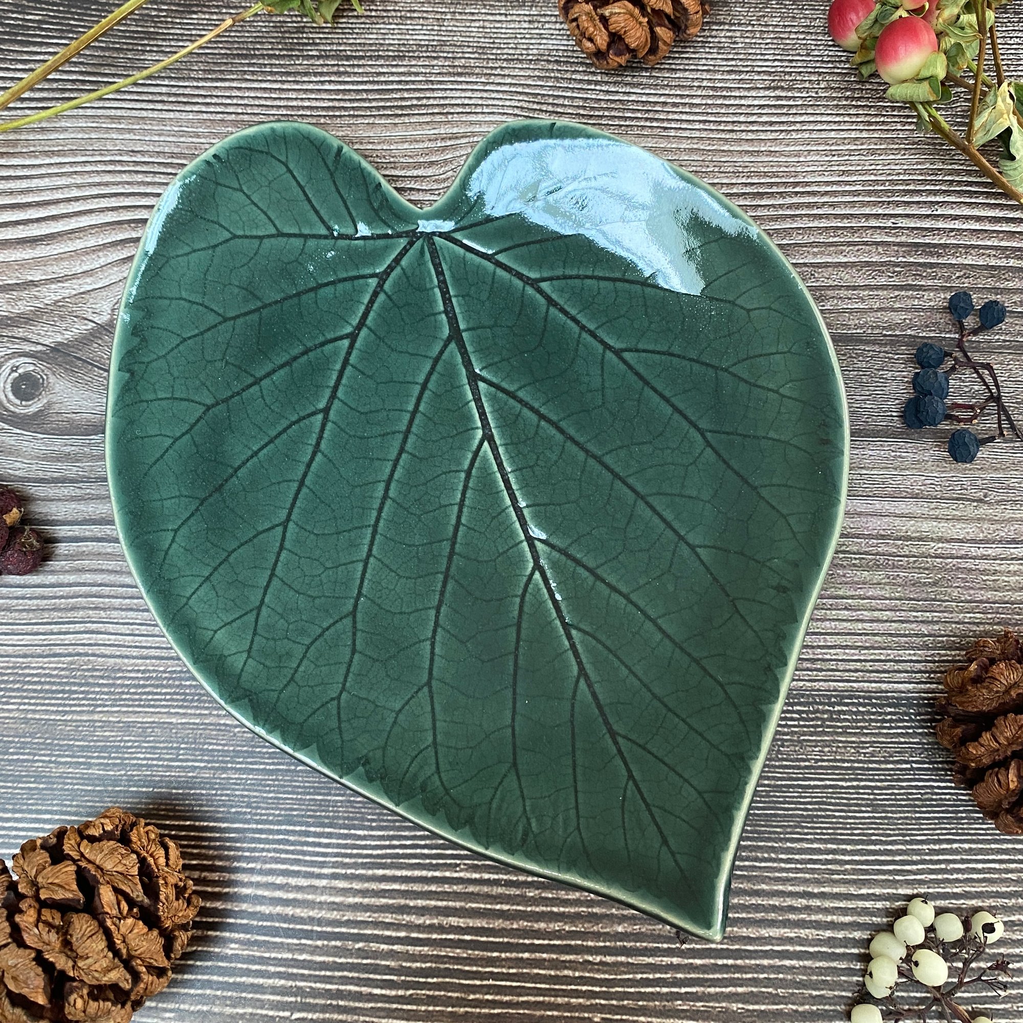 This ceramic dish is made using a real leaf from the Black Mulberry tree in Eastcote House Gardens. The natural leaf was pressed into soft clay to create a detailed imprint of its veins and organic shape. The dish is glazed in a rich green finish that highlights its natural texture and is fired to 1200°C for strength and durability,