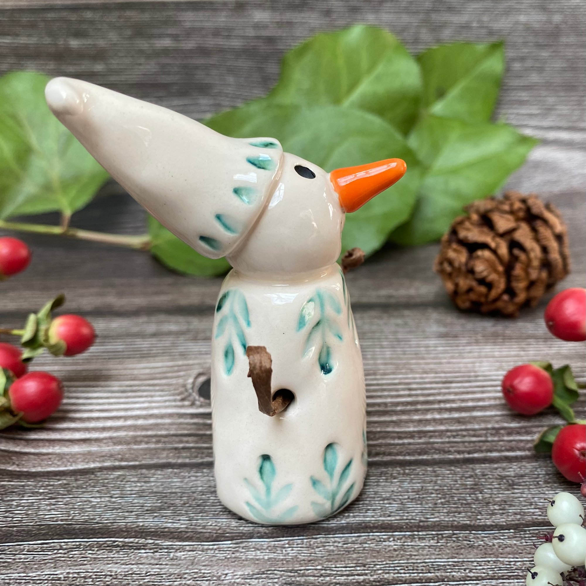 This adorable handmade snowpeep is crafted from white clay and features a green leafy design around the body and green design around the hat. Each piece is glazed with a variety of shiny finishes and fired twice in my ceramic kiln for durability and shine. The snowpeep’s arms are made from brown paper-covered wire, carefully glued in place. For safe packaging, the arms will arrive flat against the body and can easily be adjusted upon arrival.