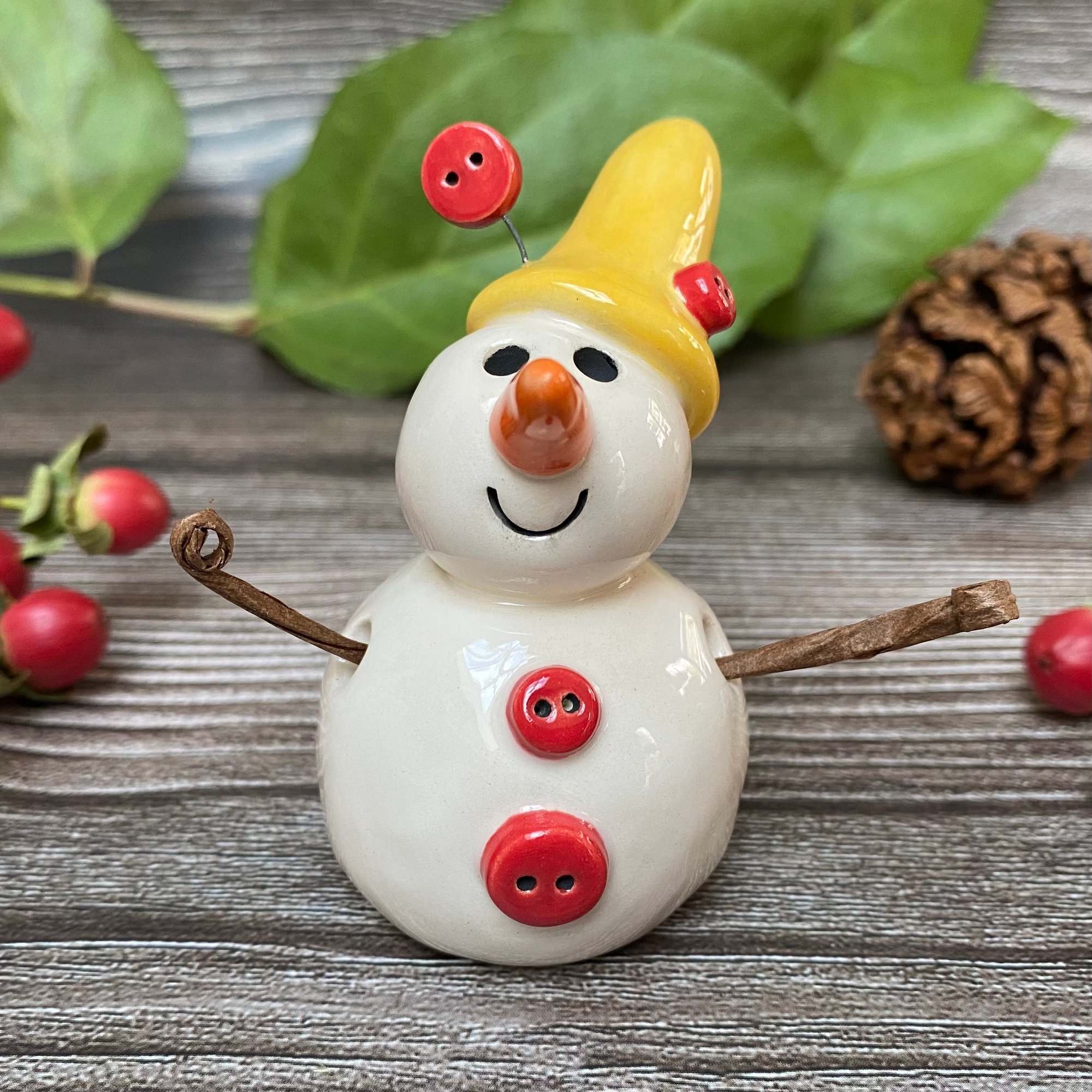 This adorable handmade snowpeep is crafted from white clay and features a yellow hat and red buttons. Each piece is glazed with a variety of shiny finishes and fired twice in my ceramic kiln for durability and shine. The snowpeep’s arms are made from brown paper-covered wire, carefully glued in place. For safe packaging, the arms will arrive flat against the body and can easily be adjusted upon arrival.