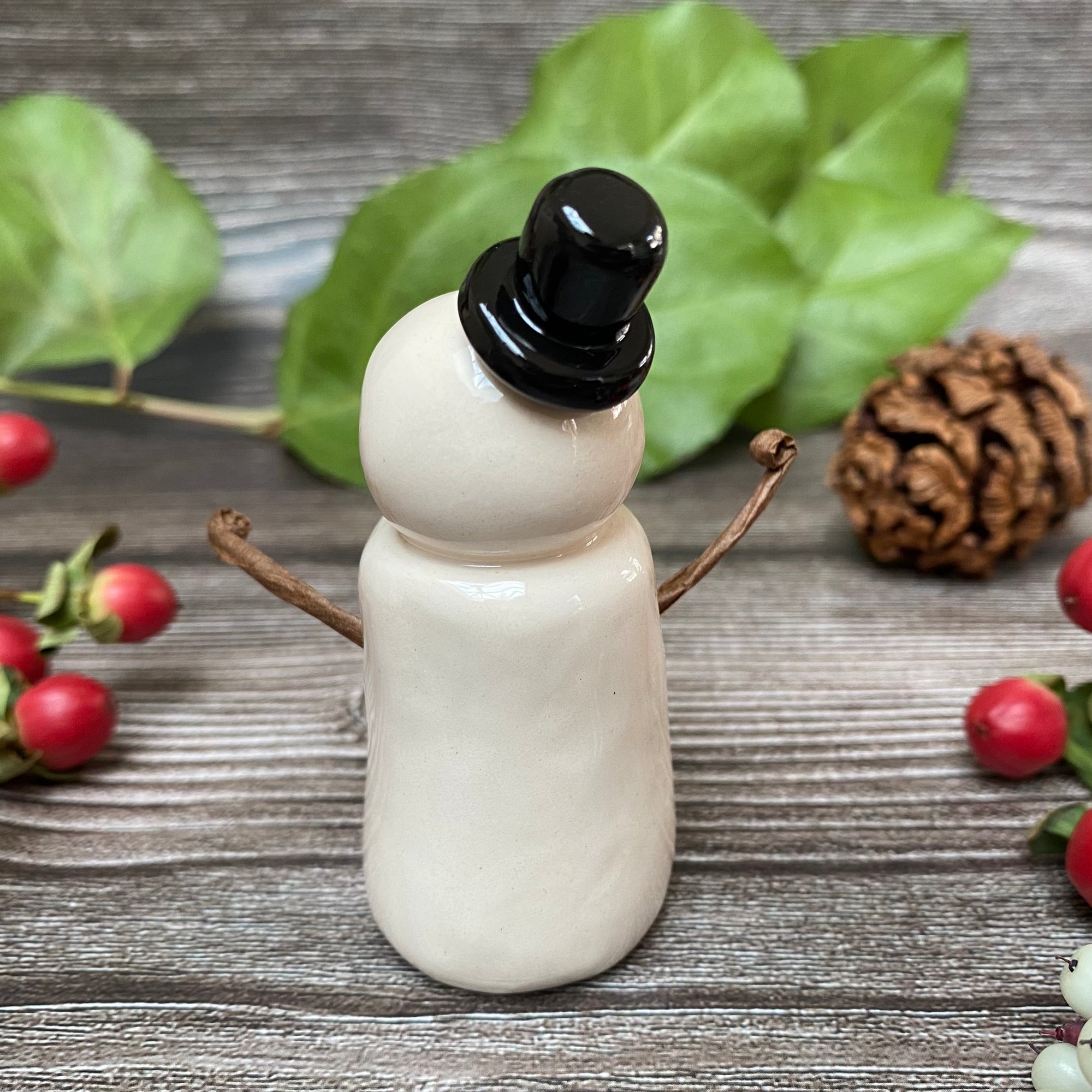 This adorable handmade snowpeep is crafted from white clay and features a shiny black hat and three blue buttons. Each piece is glazed with a variety of shiny finishes and fired twice in my ceramic kiln for durability and shine. The snowpeep’s arms are made from brown paper-covered wire, carefully glued in place. For safe packaging, the arms will arrive flat against the body and can easily be adjusted upon arrival.
