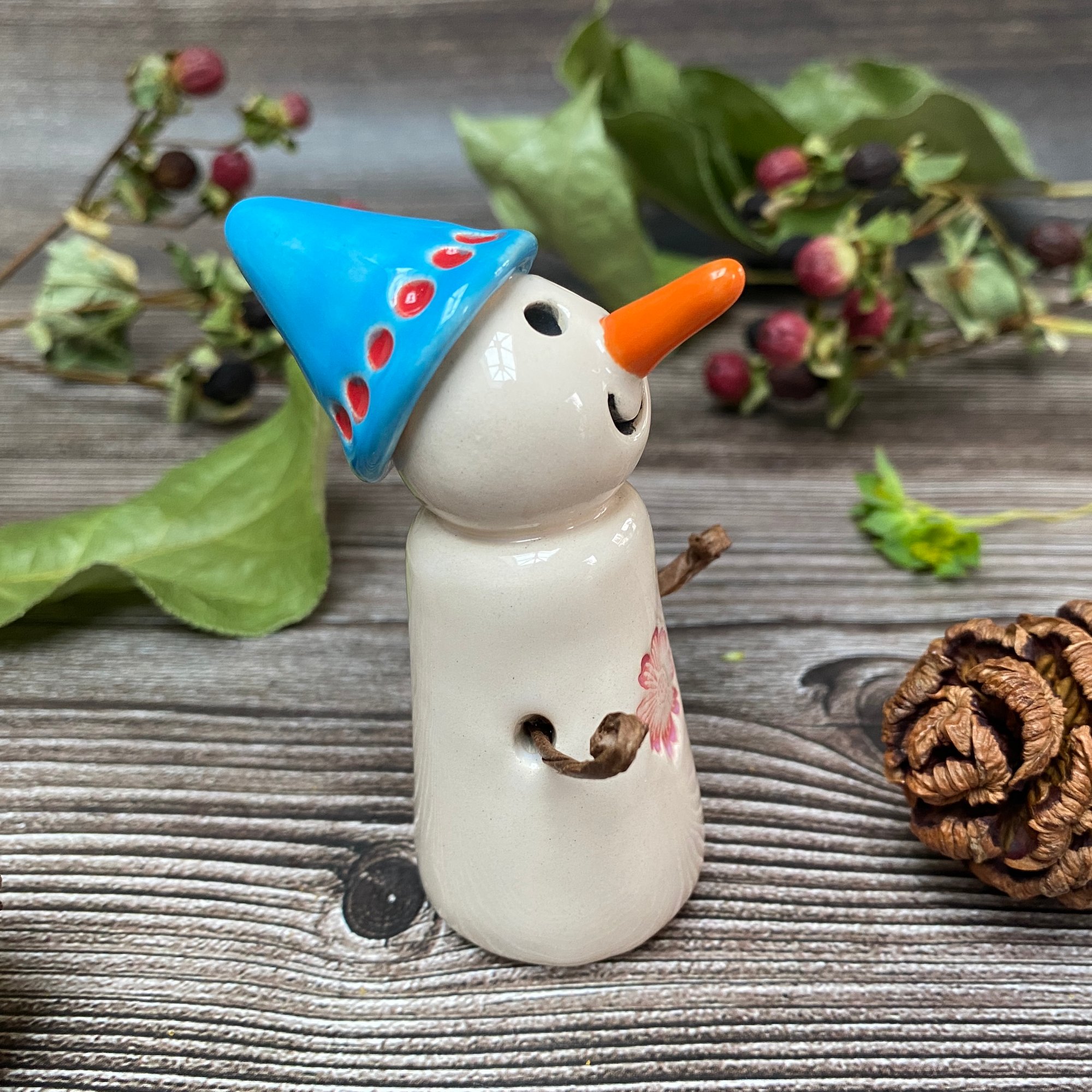 This adorable handmade snowpeep is crafted from white clay and features a shiny blue and red hat with a red flower on the belly. Each piece is glazed with a variety of shiny finishes and fired twice in my ceramic kiln for durability and shine. The snowpeep’s arms are made from brown paper-covered wire, carefully glued in place. For safe packaging, the arms will arrive flat against the body and can easily be adjusted upon arrival.