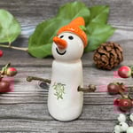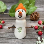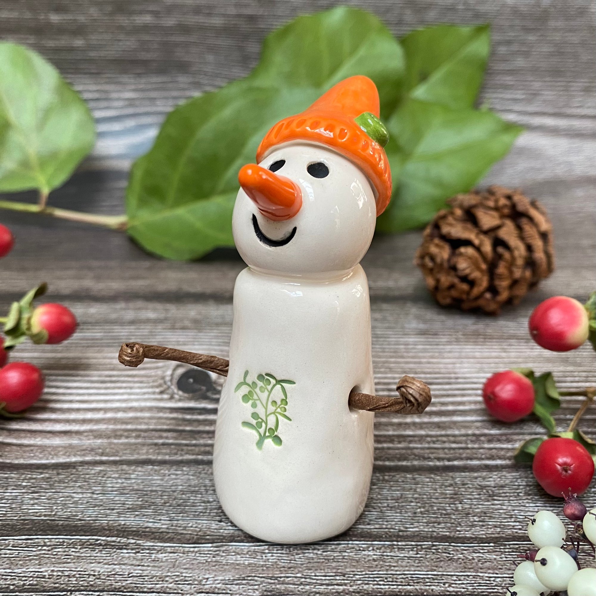 This adorable handmade snowpeep is crafted from white clay and features a shiny orange hat with a green button and a mistletoe belly. Each piece is glazed with a variety of shiny finishes and fired twice in my ceramic kiln for durability and shine. The snowpeep’s arms are made from brown paper-covered wire, carefully glued in place. For safe packaging, the arms will arrive flat against the body and can easily be adjusted upon arrival.