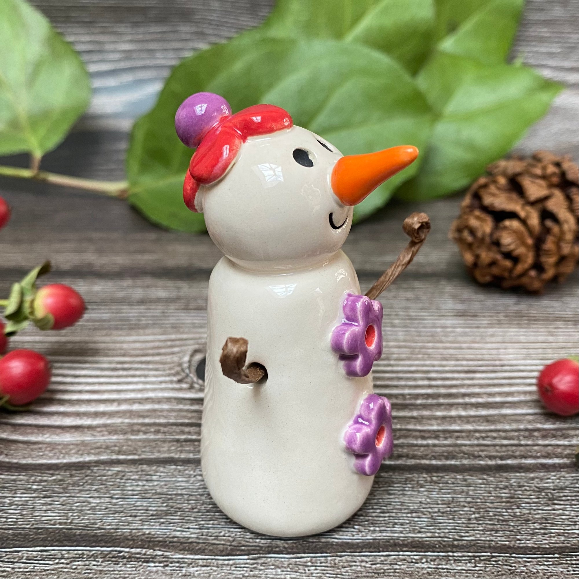 Handmade Ceramic Snowpeep with Red/Purple Flowers
