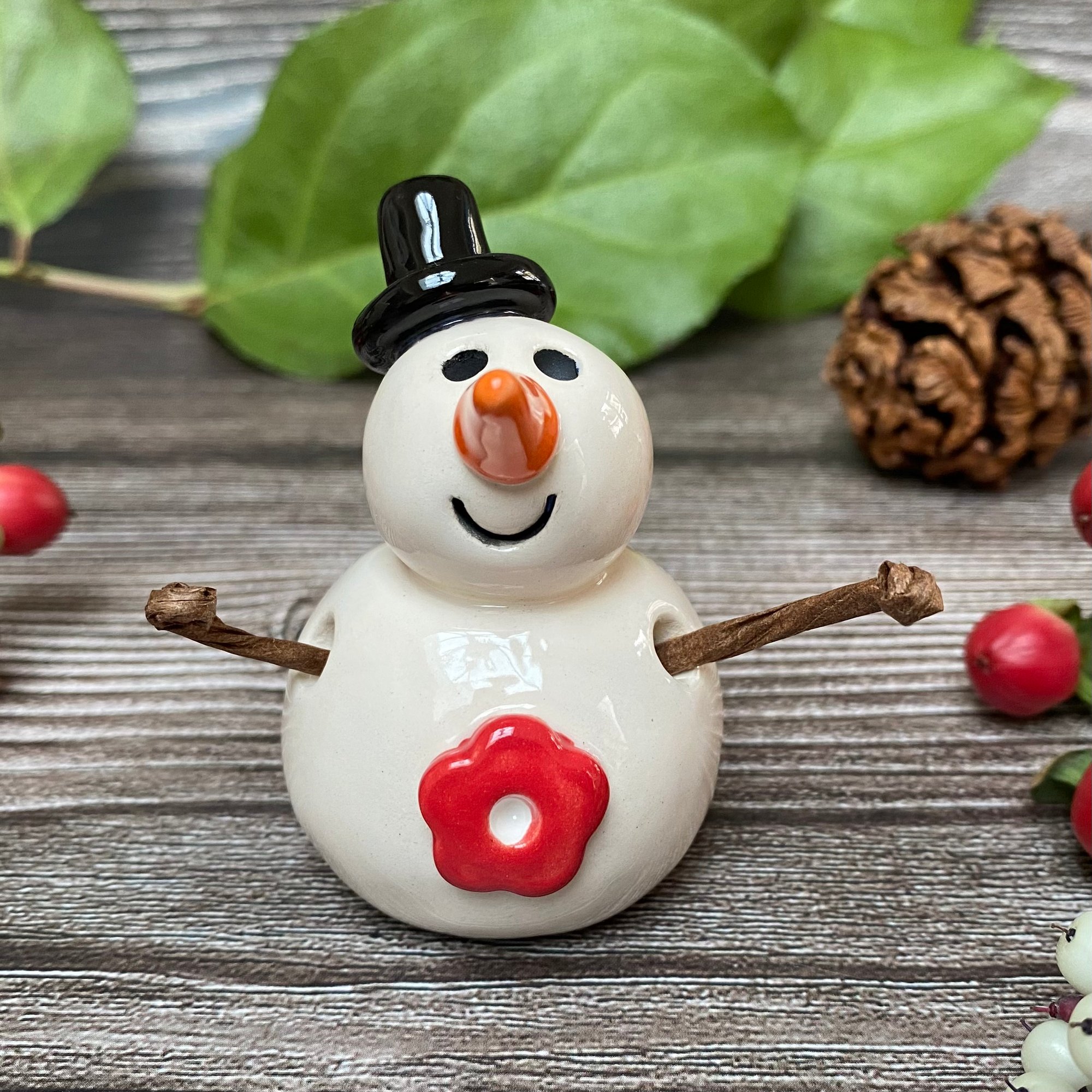 This adorable handmade snowpeep is crafted from white clay and features a shiny black top hat and a red and white flower on the belly. Each piece is glazed with a variety of shiny finishes and fired twice in my ceramic kiln for durability and shine. The snowpeep’s arms are made from brown paper-covered wire, carefully glued in place. For safe packaging, the arms will arrive flat against the body and can easily be adjusted upon arrival.