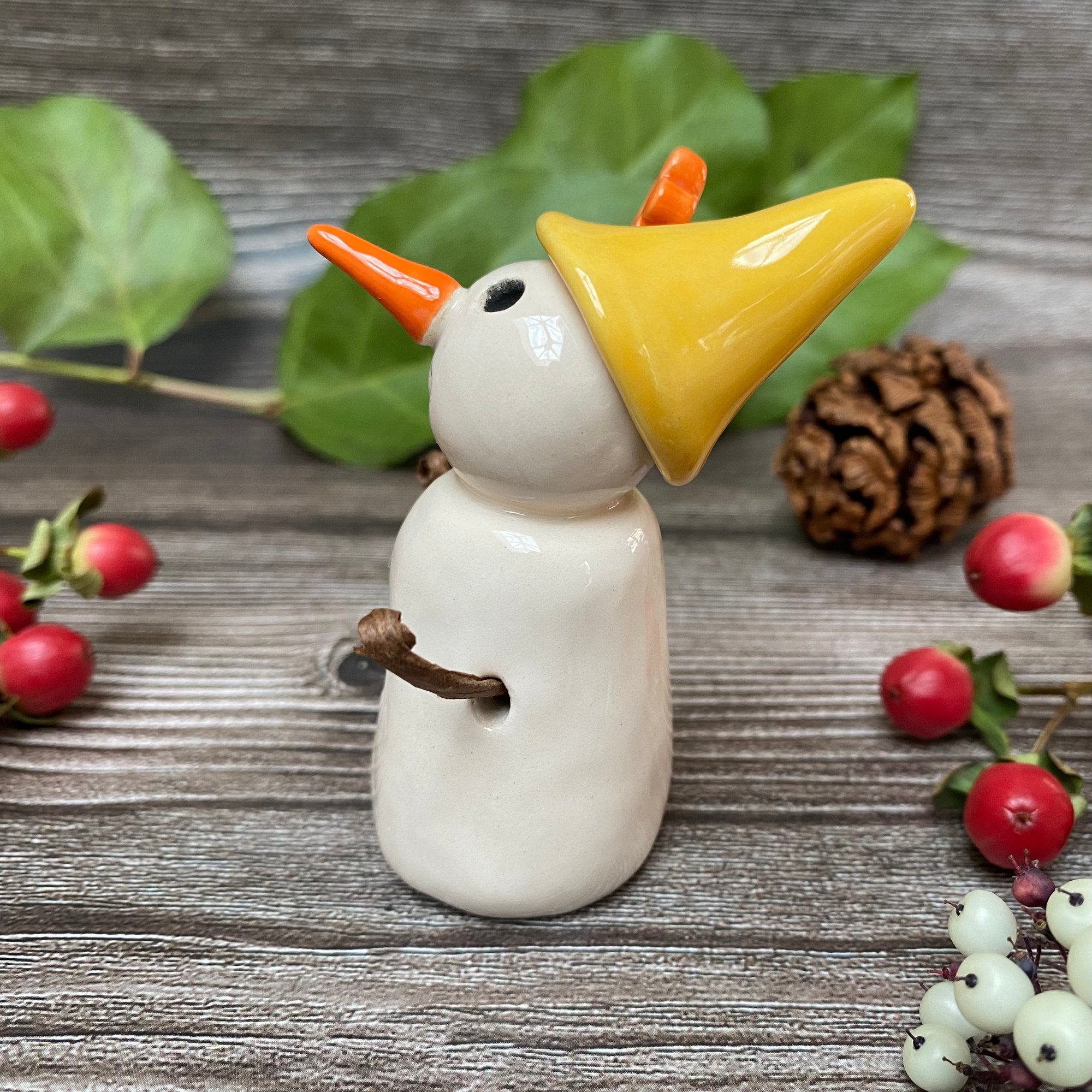 This adorable handmade snowpeep is crafted from white clay and features a shiny yellow hat and two orange flowers, one on the hat and one on the belly. Each piece is glazed with a variety of shiny finishes and fired twice in my ceramic kiln for durability and shine. The snowpeep’s arms are made from brown paper-covered wire, carefully glued in place. For safe packaging, the arms will arrive flat against the body and can easily be adjusted upon arrival.