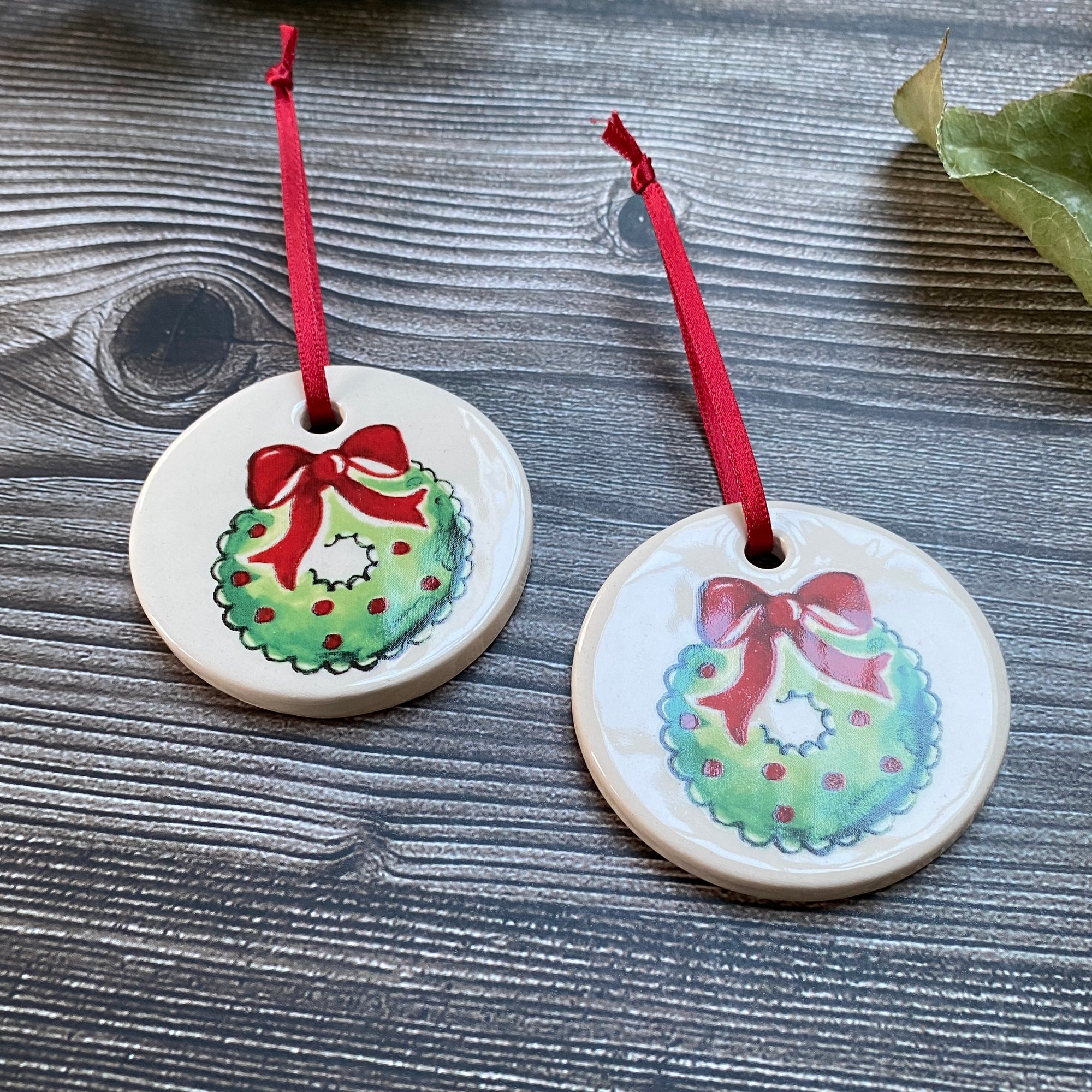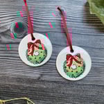 Add a touch of handcrafted charm to your festive décor with these ceramic Christmas tree ornaments. Lovingly made from earthenware clay, each decoration is finished with a transparent glaze before a Christmas Wreath decal is applied and they are fired for a THIRD time in the ceramic kiln.