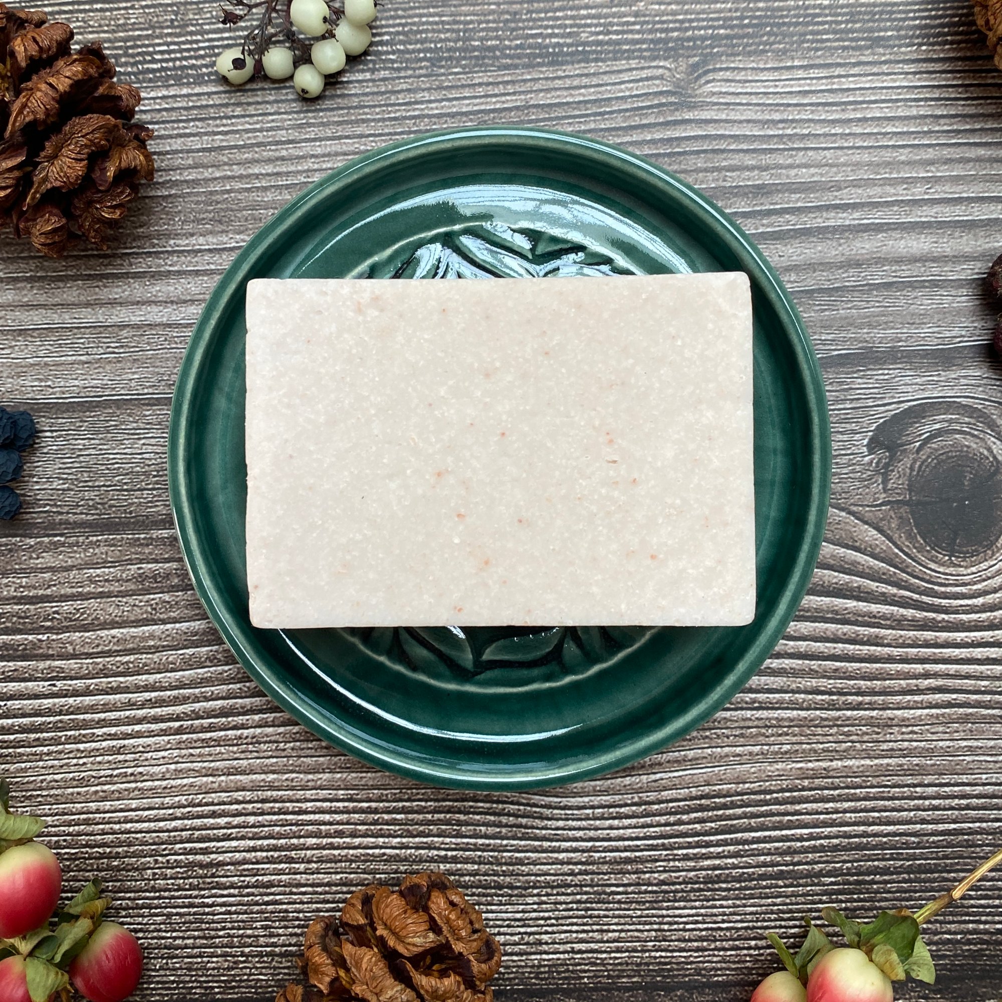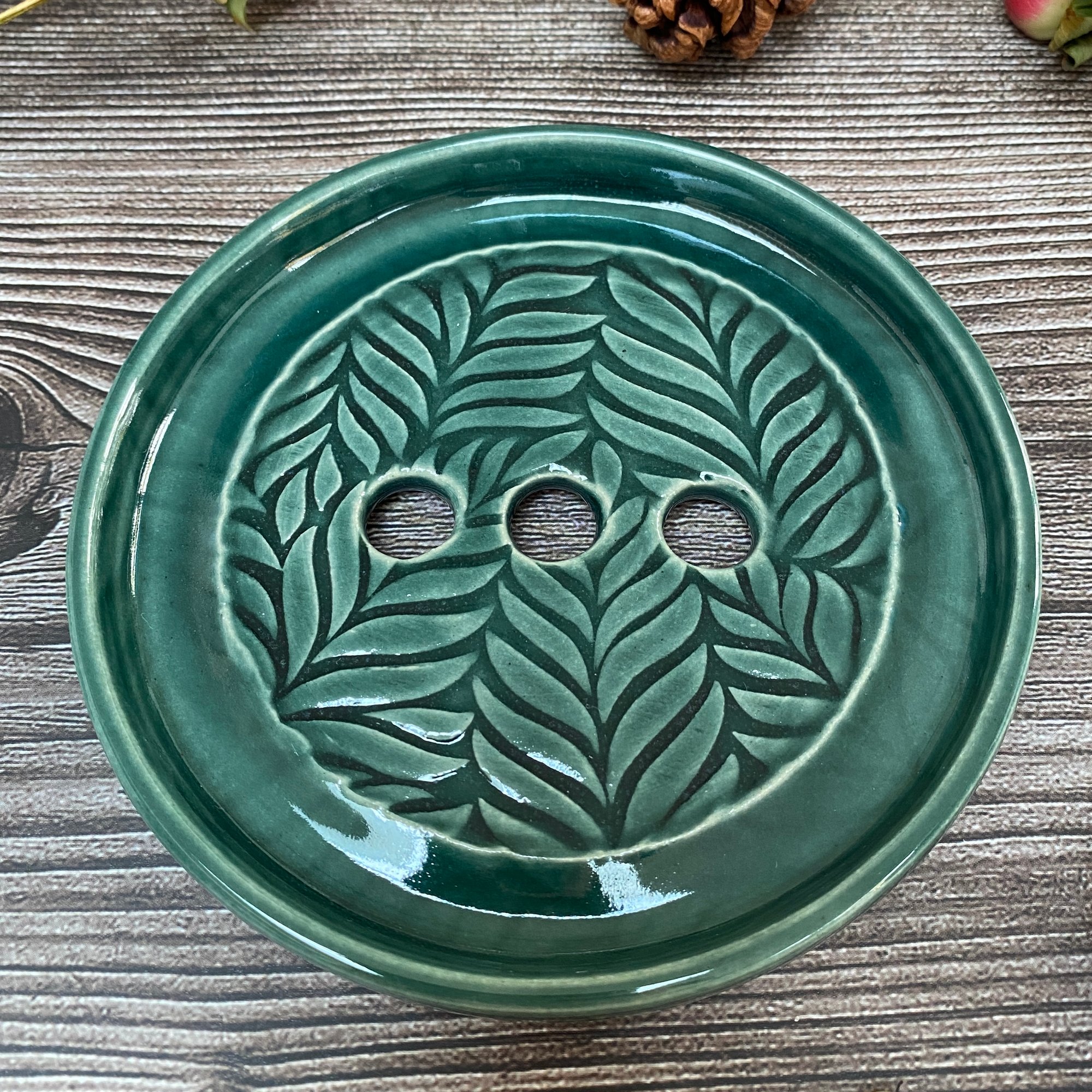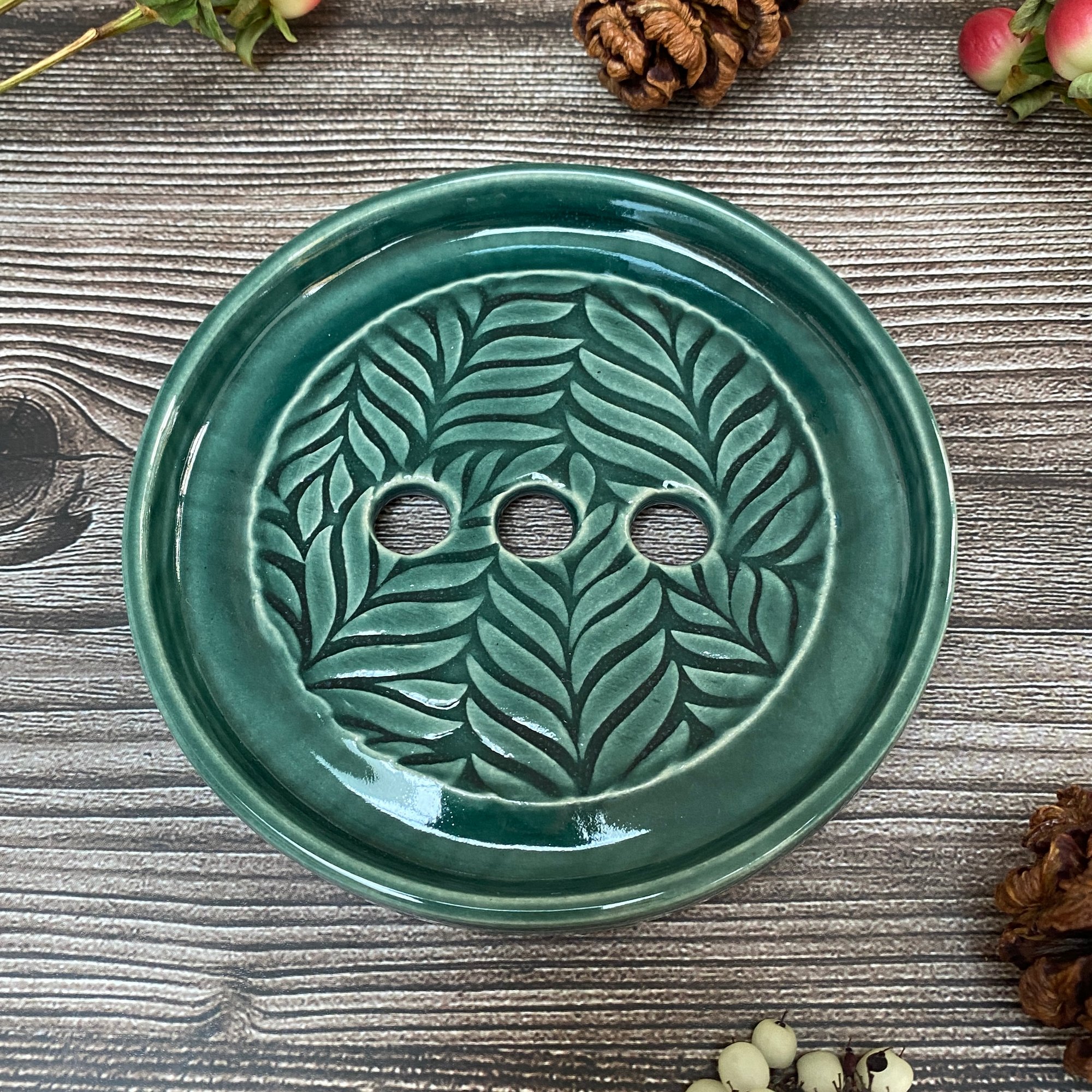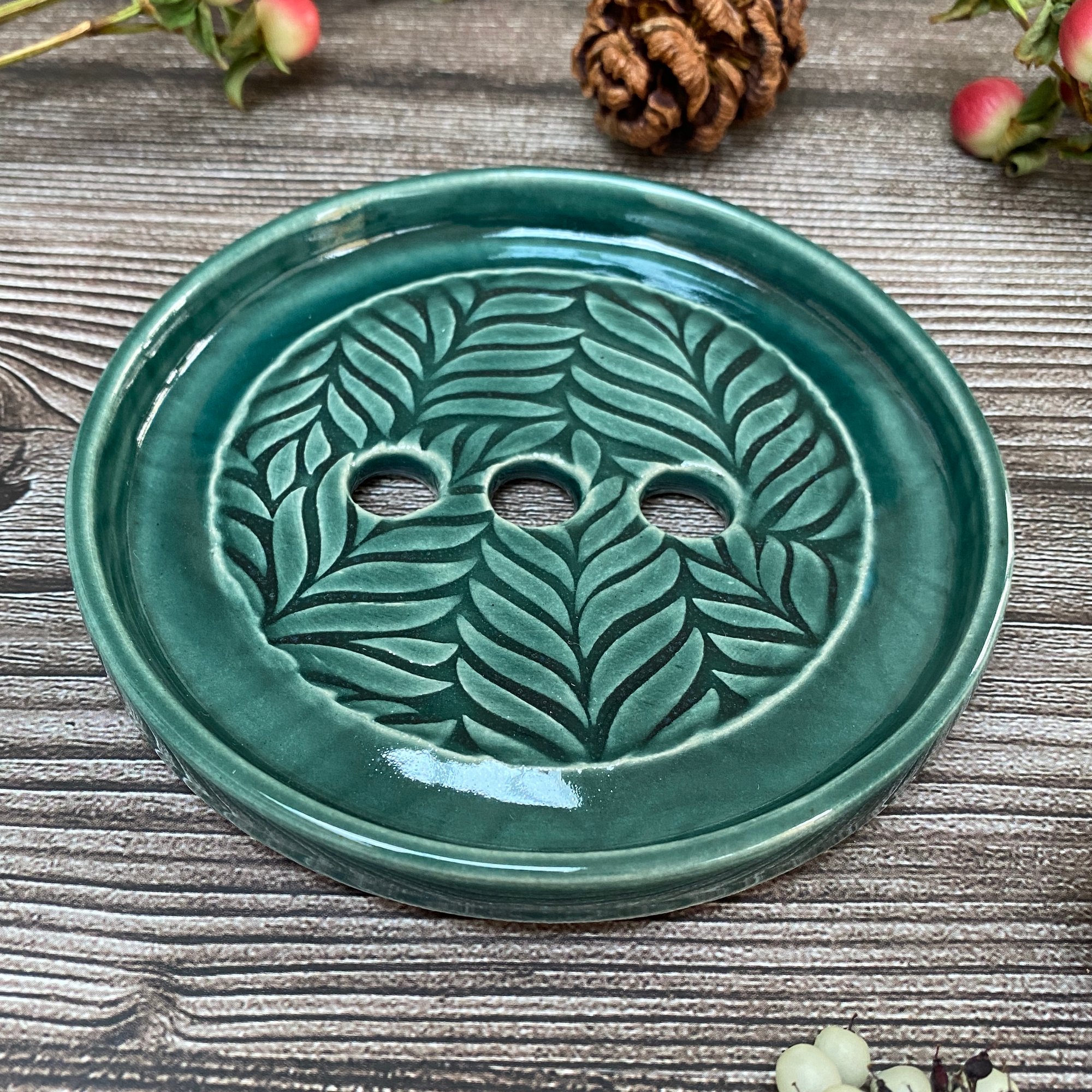 This handmade ceramic soap dish has been thrown on the pottery wheel and features a beautiful leafy texture rolled into the surface. Three drainage holes have been cut to help keep your soap dry between uses. Glazed in a rich, glossy green, it’s a versatile piece that suits both modern and traditional bathrooms.