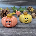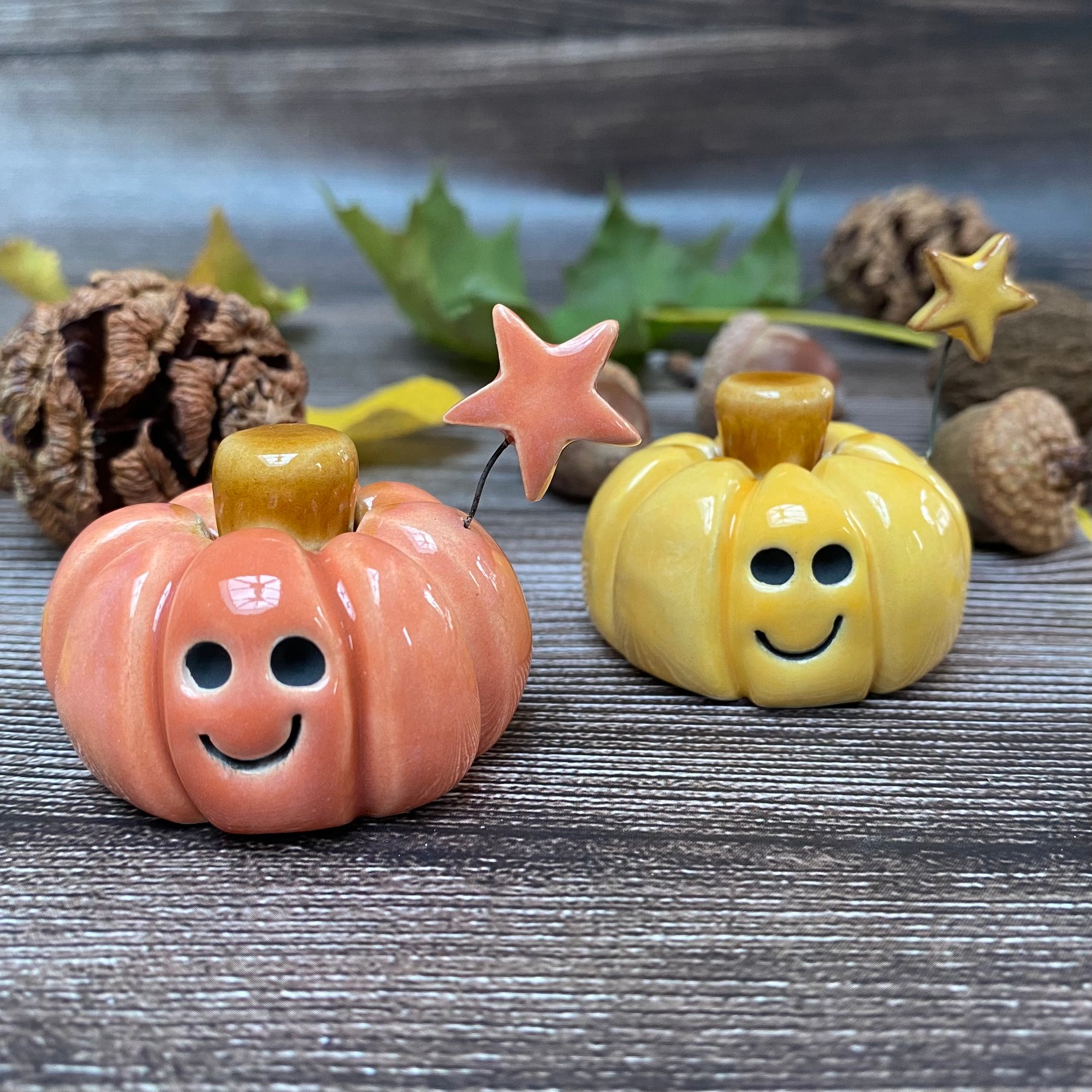 Each pumpkin has been formed by hand using white earthenware clay. A smiley face has been stamped and a star topper has been added. The pumpkins have been glazed in pink, yellow and honey colour glazes.