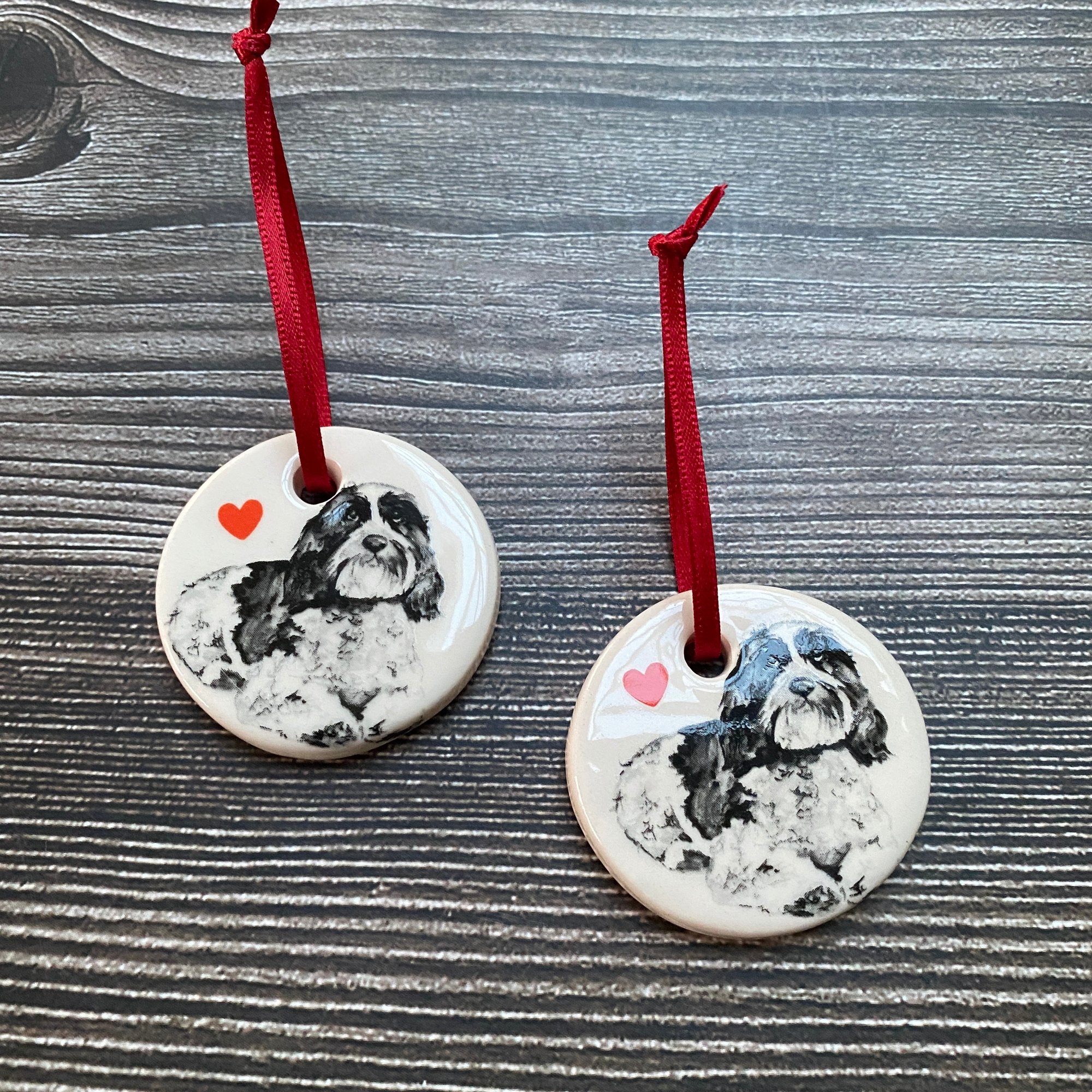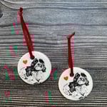 Lovingly made from earthenware clay, each hanging decoration is finished with a transparent glaze before a little black and white dog and heart decal is applied and they are fired for a THIRD time in the ceramic kiln.