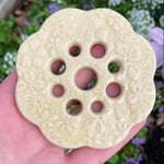 Flower frogs make flower arranging easy. Just place this handmade ceramic flower frog on top of a jar, glass, bottle, cup or mug and pop the flowers in through the holes. These are handmade and vary in design, thickness and finish.