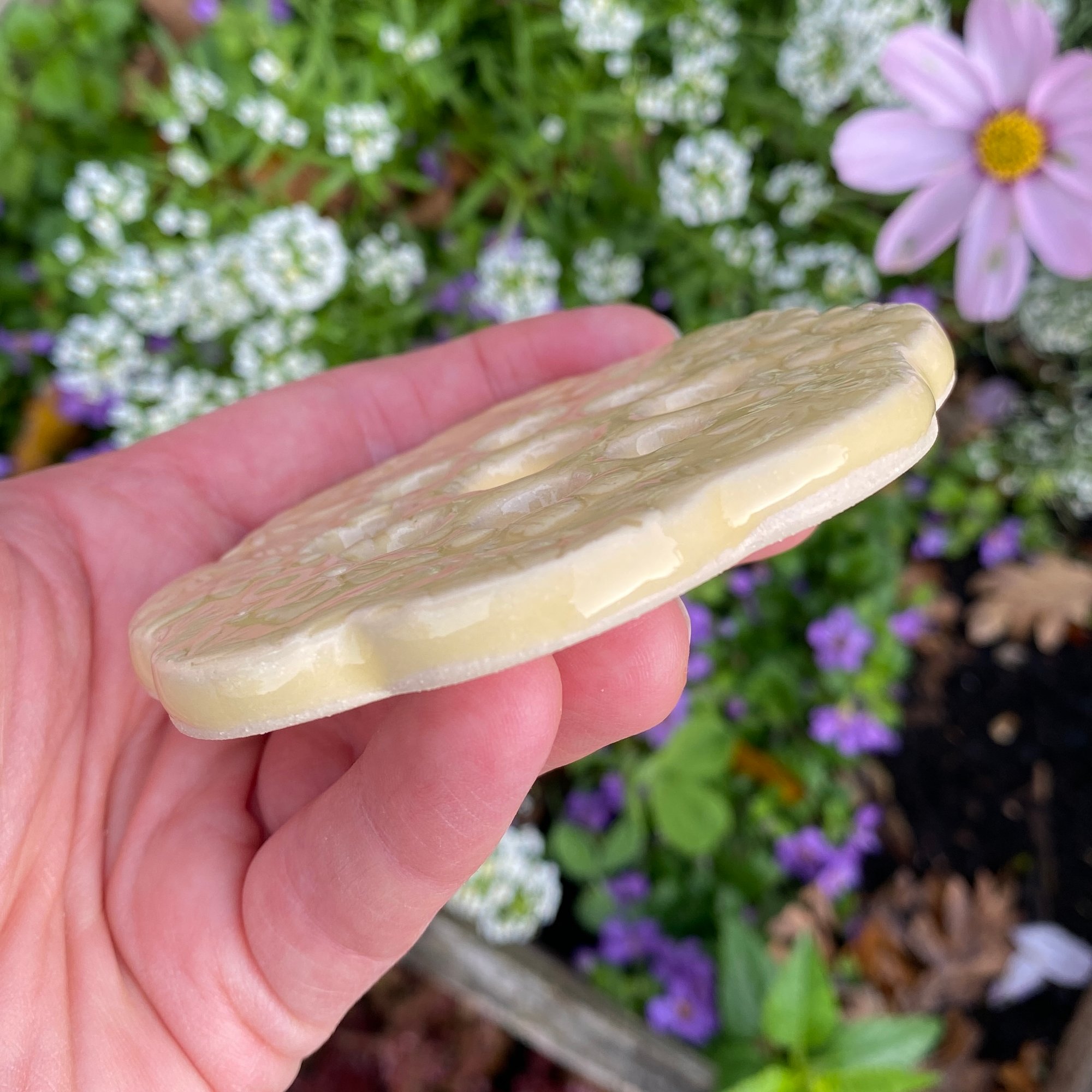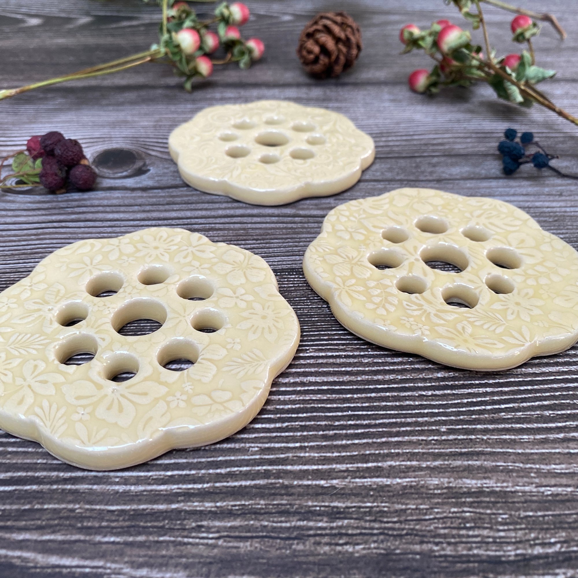 This handmade ceramic flower frog is textured and glazed in a translucent pale yellow. The back is unglazed.
