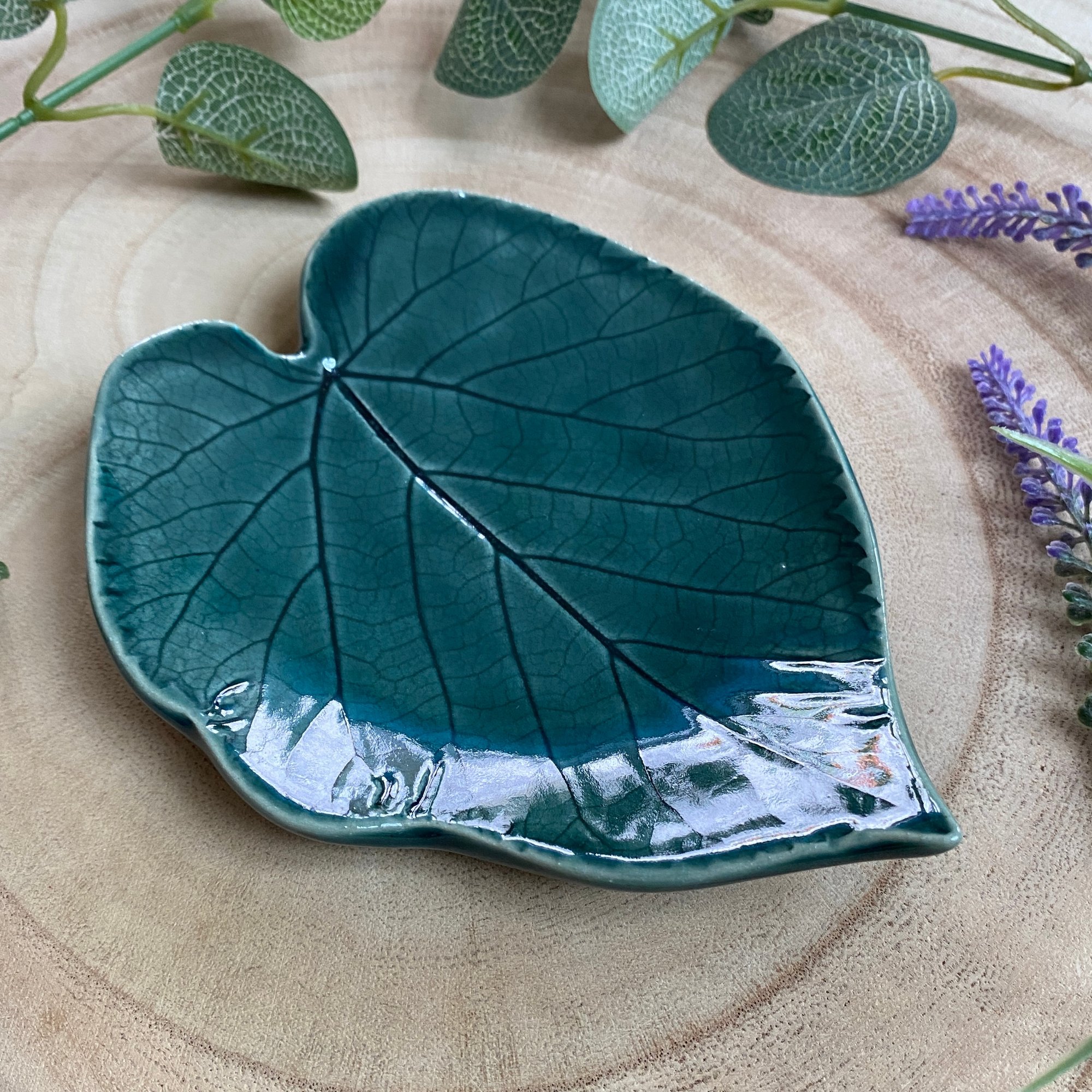 This green leaf dish has been made using creamy stoneware clay. A real leaf was impressed into the clay to form the texture. It has been glazed in a rainforest green glaze.