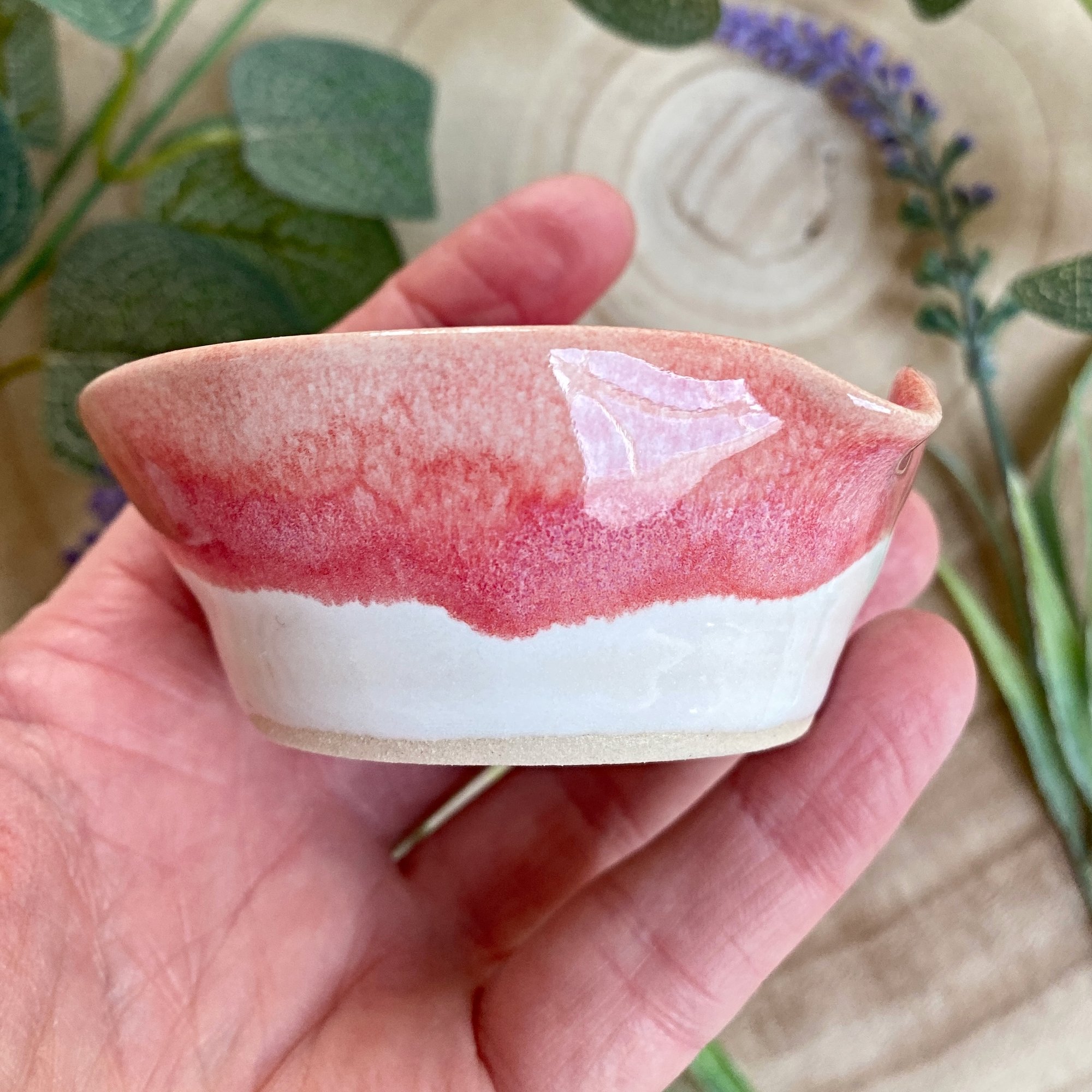 This heart shaped dish has been thrown on the pottery wheel using creamy smooth stoneware clay. I have used two glazes on this dish, an opaque white layered with a pretty pink glaze which runs and creates interest.