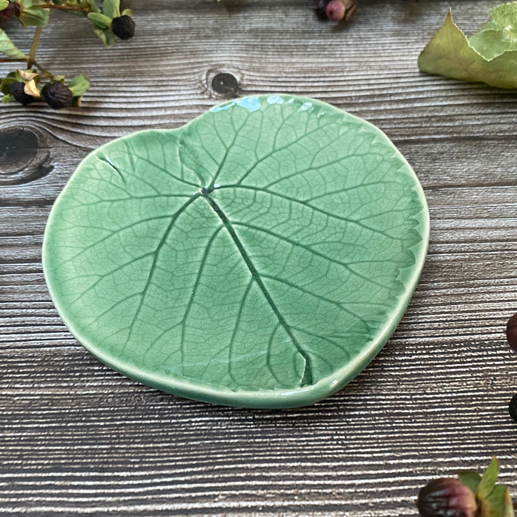 This green leaf dish has been made using creamy stoneware clay. A real leaf was impressed into the clay to form the texture. It has been glazed in a soft green glaze.