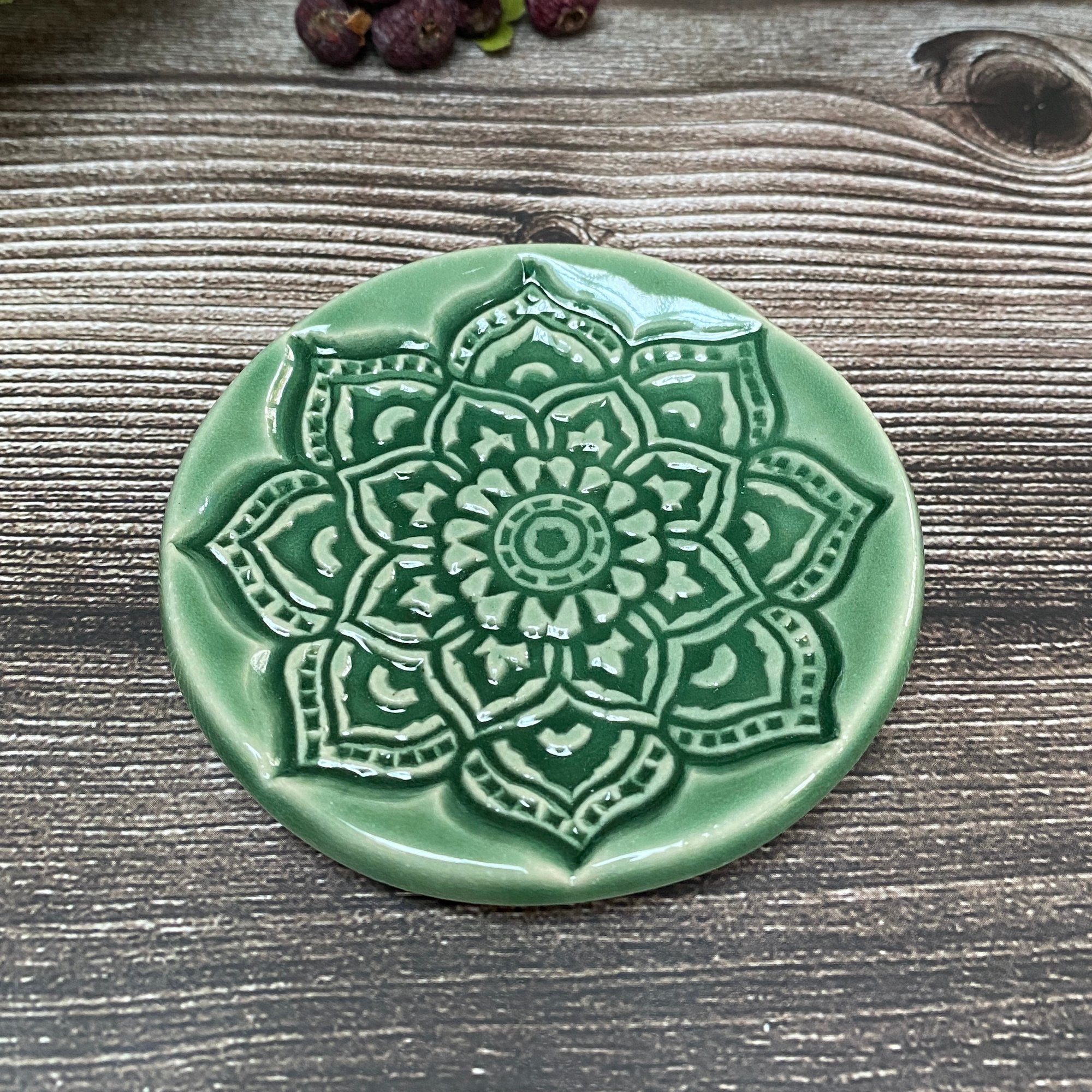 This pretty dish is made from creamy stoneware clay and finished with a soft green glaze. I used a wooden mandala block stamp to press the design before cutting and shaping it, gently raising the edges to form a curved dish.