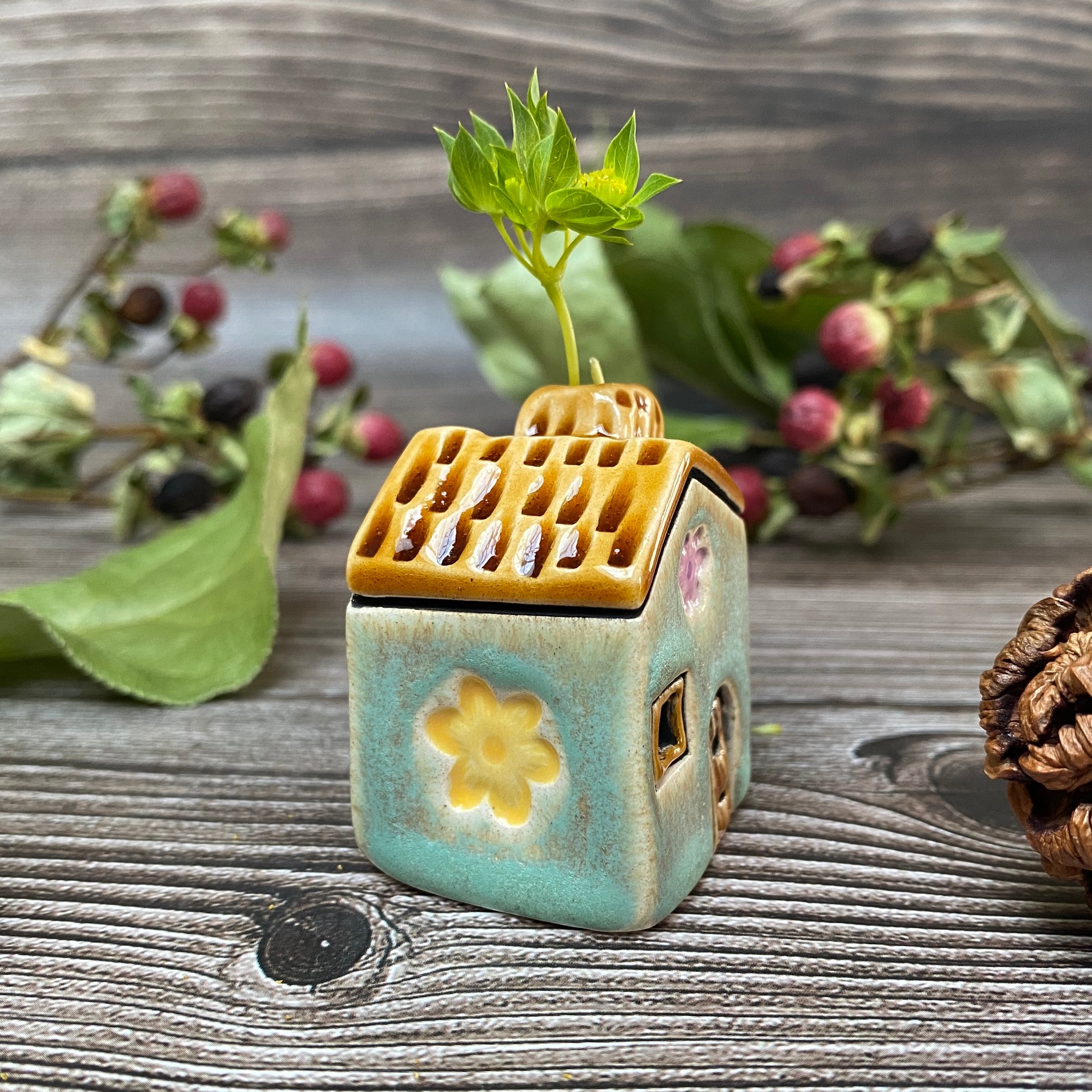 This little handmade ceramic house has been crafted from white earthenware clay and finished with hand-carved details on all sides, including windows, doors, and purple and yellow flowers. The honey-coloured roof and chimney add warmth, while the soft green glaze with honey coloured accents gives it a warm and cosy feel.