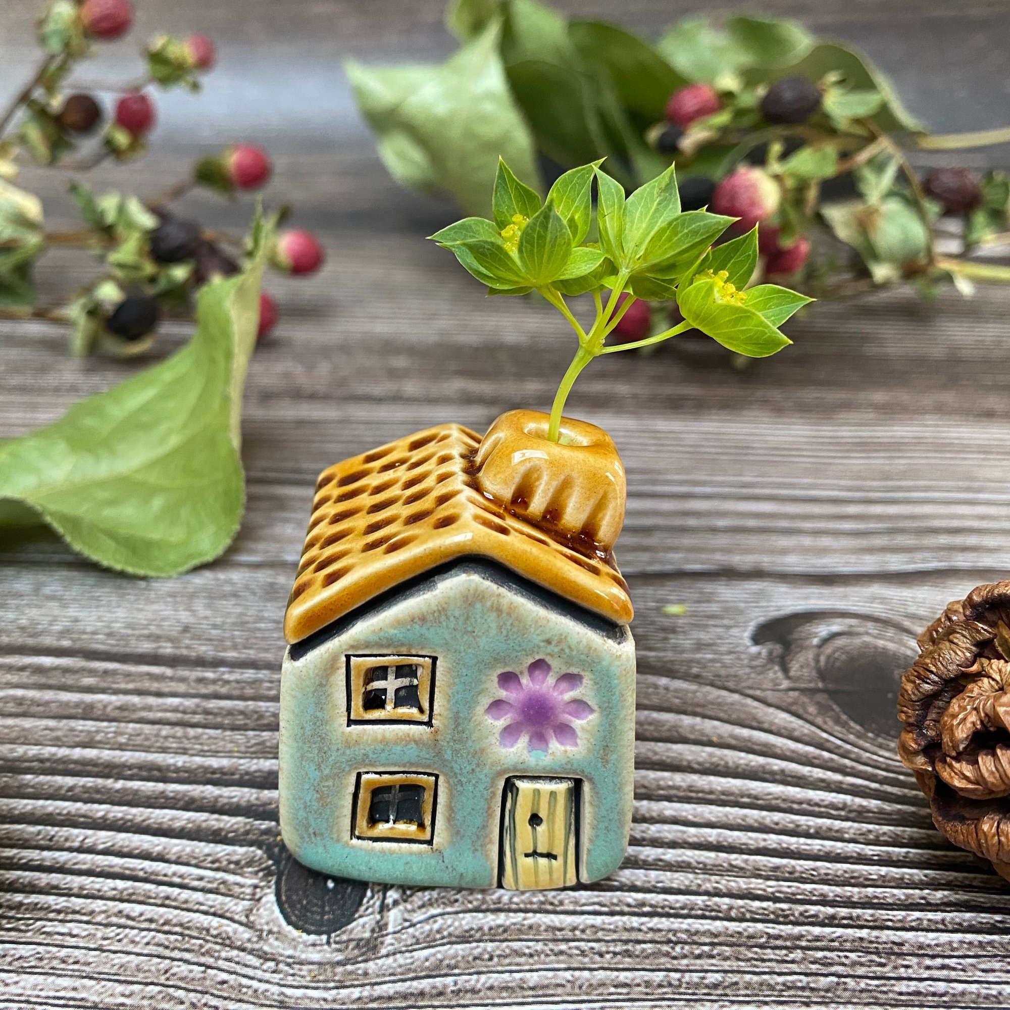 Soft Green Ceramic Mini House with Chimney - Purple/Yellow Flowers