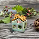 Soft Green Ceramic Mini House with Chimney - Red Flowers