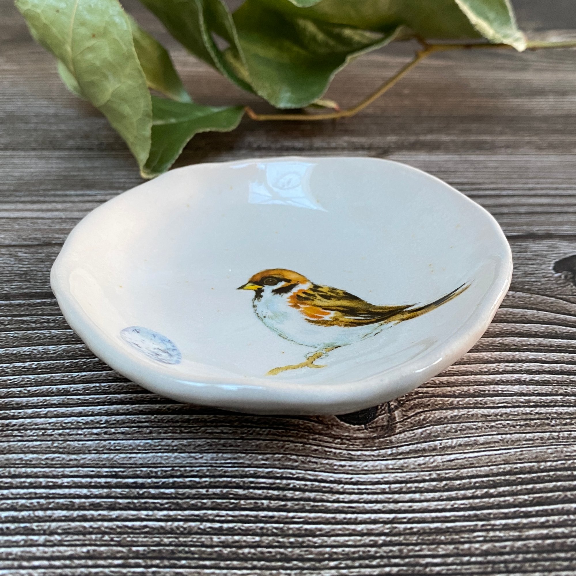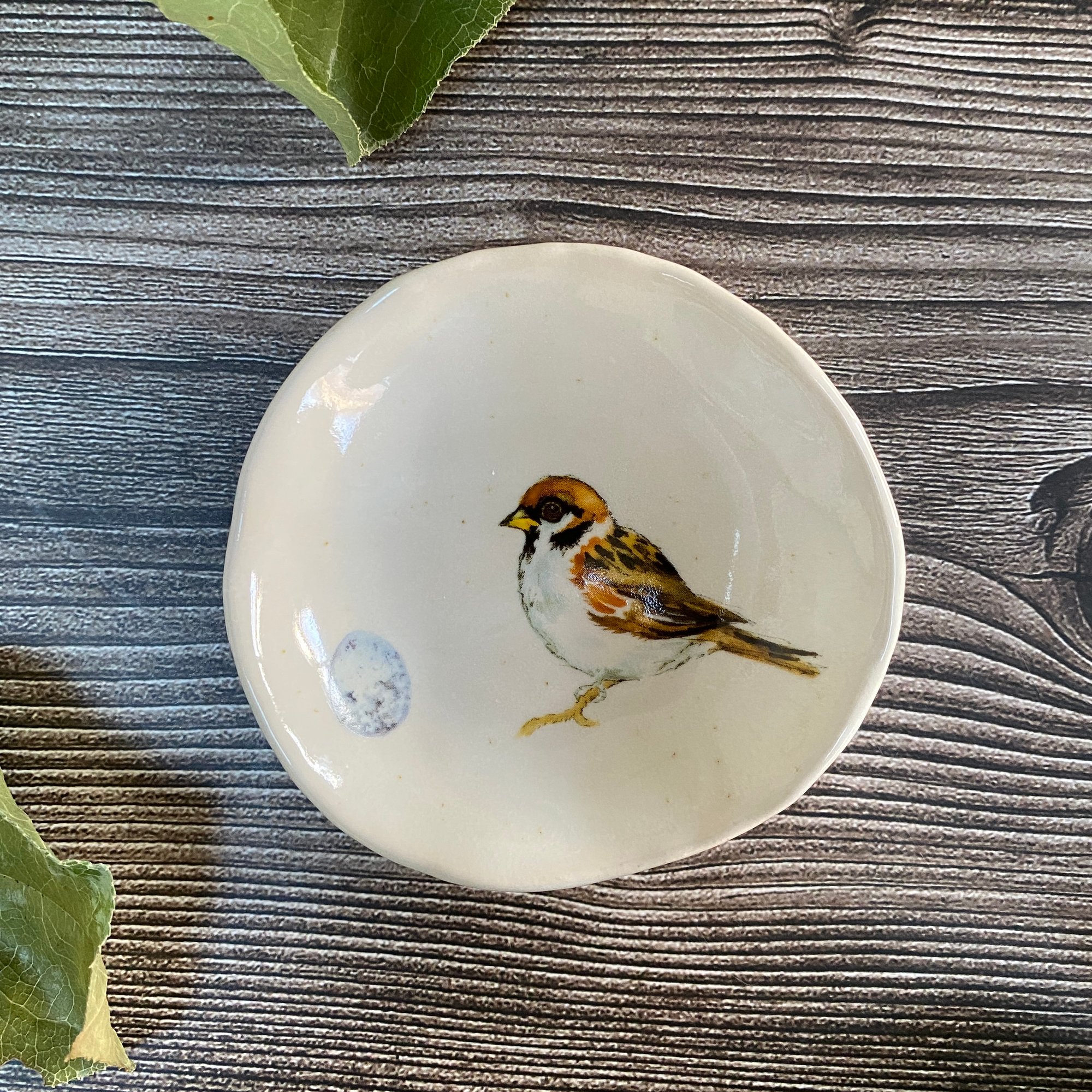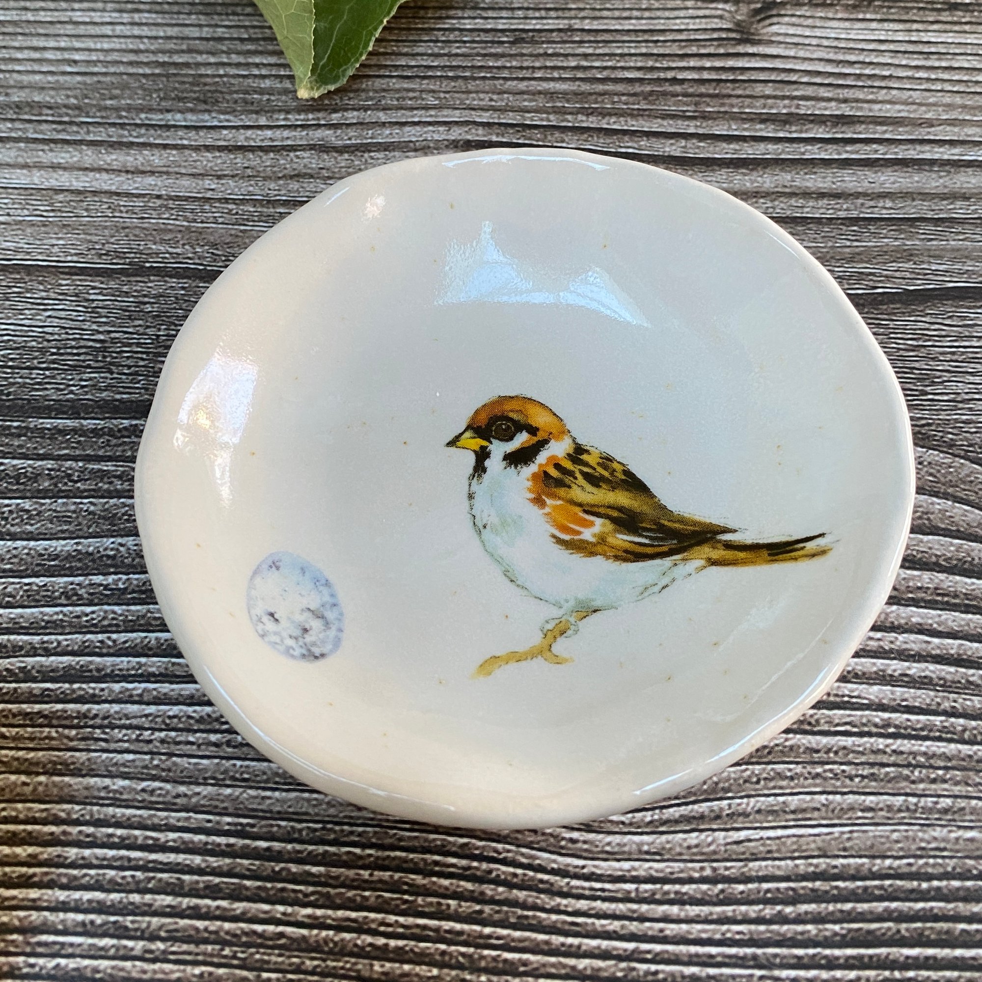 This pretty dish has been made using the pinch method in creamy stoneware clay and a beautiful cream lightly speckled glaze. This glaze is the perfect background for this gorgeous Sparrow and egg decal.