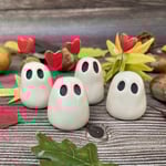 Wee ceramic ghost made using white clay with coloured and transparent glazes.