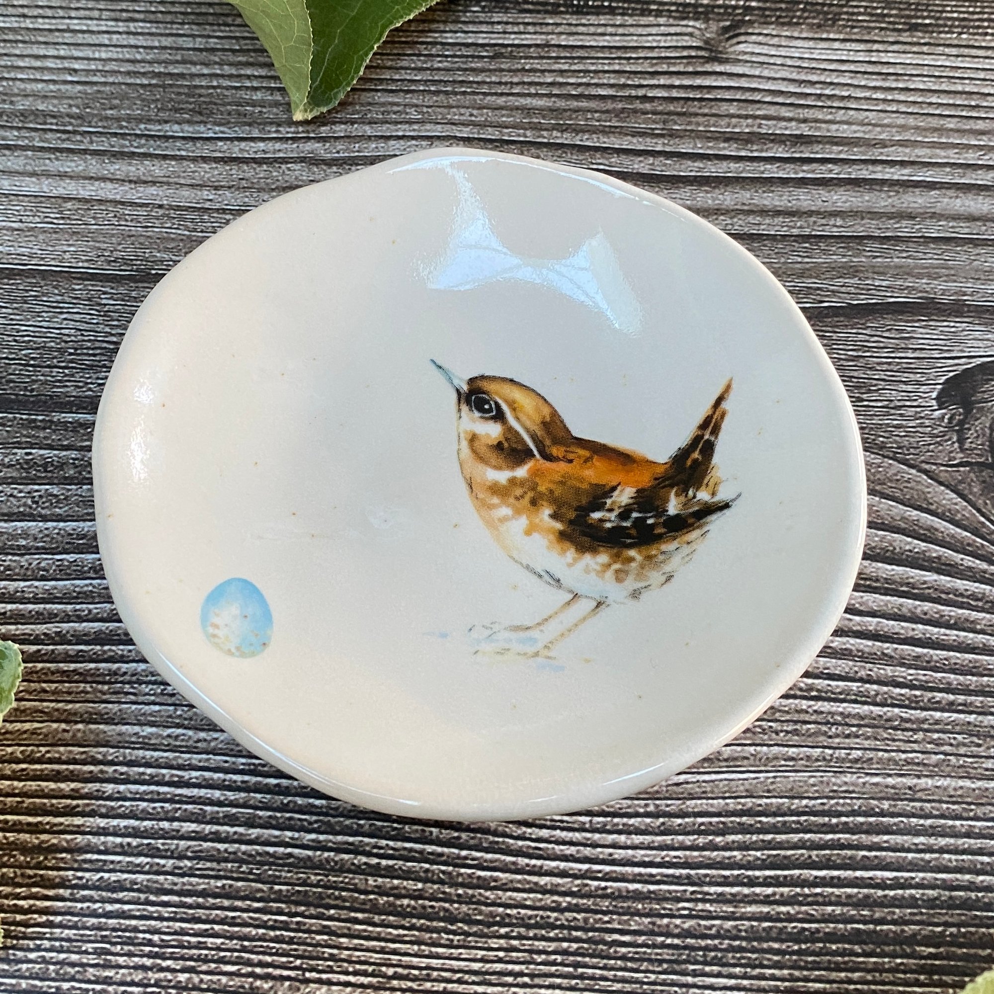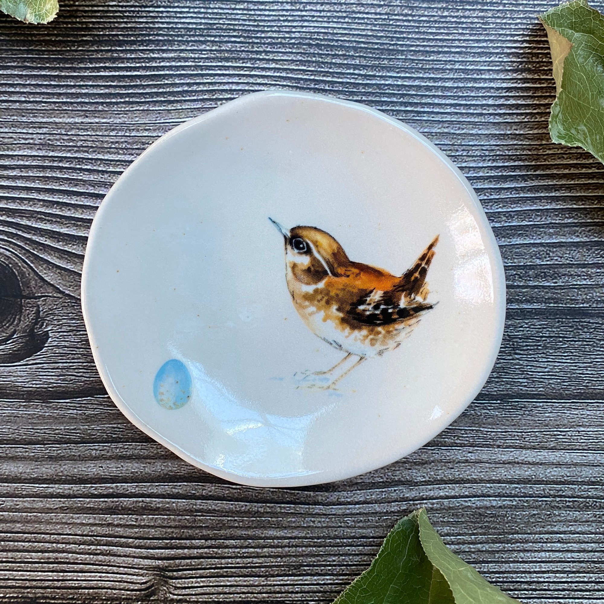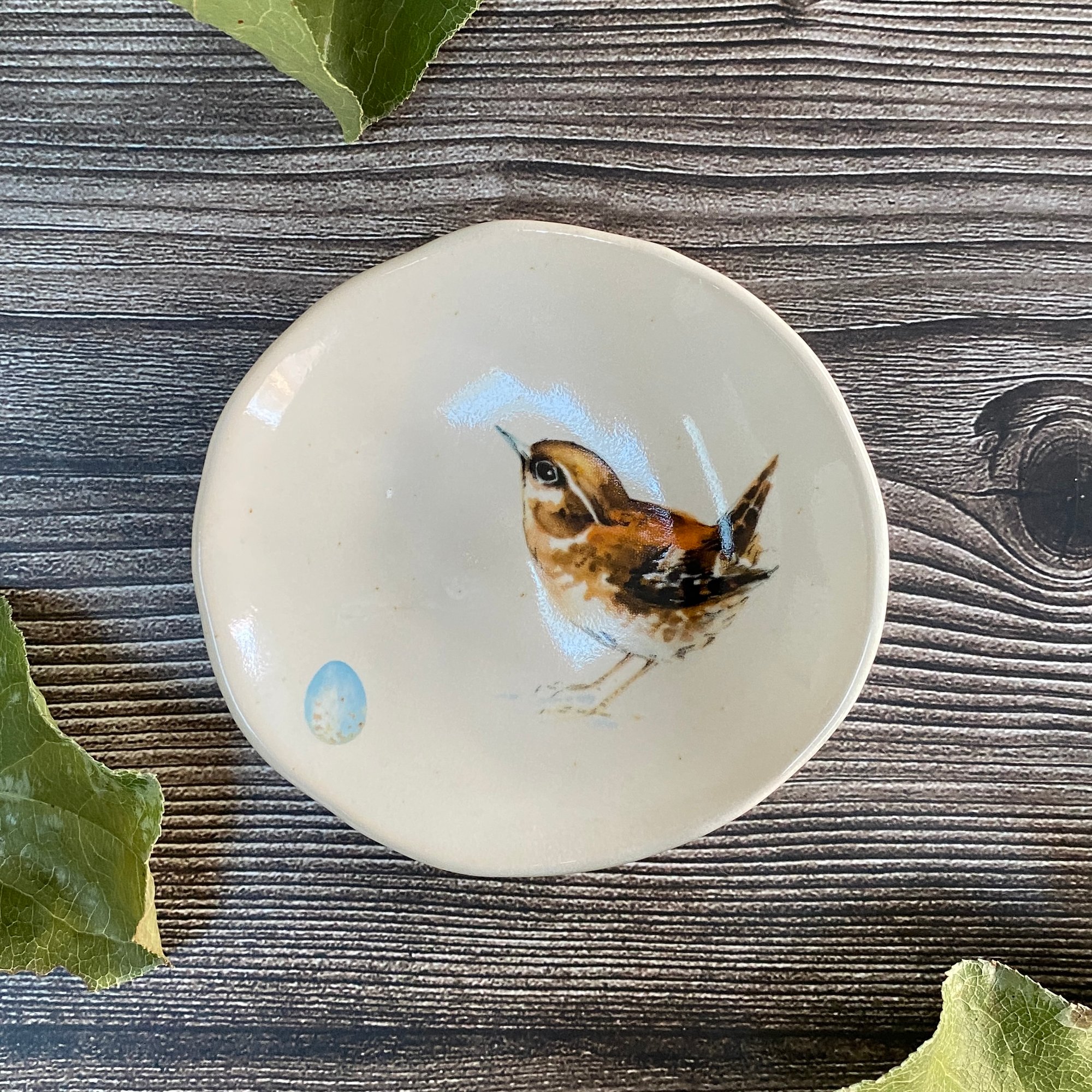 This pretty dish has been made using the pinch method in creamy stoneware clay and a beautiful cream lightly speckled glaze. This glaze is the perfect background for this gorgeous Wren and egg decal.